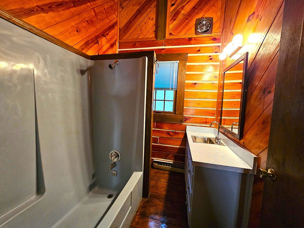 This bathroom features a cozy, rustic aesthetic, highlighted by warm wooden walls and ceiling with a diagonal pattern. A white bathtub is positioned against one wall, offering a contrast to the natural wood tones. The adjacent vanity has a minimalist design with a white countertop and a small sink. On the left, a mirror above the vanity reflects light, enhancing the space’s brightness. A narrow window allows natural light to filter in, framed with wood that matches the bathroom’s overall decor. The floor is also wooden, contributing to the homey vibe of this intimate space.