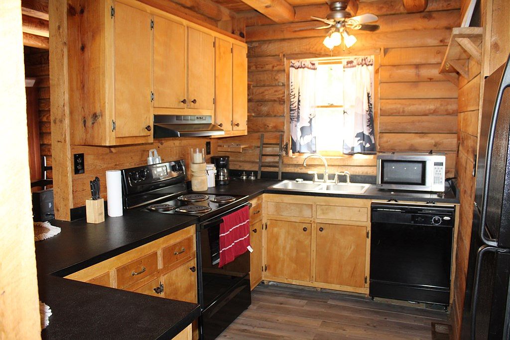 This kitchen features natural wood cabinetry, accented with a sleek black countertop that contrasts beautifully with the light wood. Log walls provide a rustic charm, enhancing the warm, inviting atmosphere. Modern appliances, including a stainless steel microwave and black dishwasher, complement the vintage feel. A double basin sink is conveniently positioned beneath a window adorned with playful deer-themed curtains, allowing natural light to illuminate the area. A ceiling fan adds both functionality and style. The overall color palette merges earthy tones with modern touches, creating a cozy yet updated cooking space filled with character.