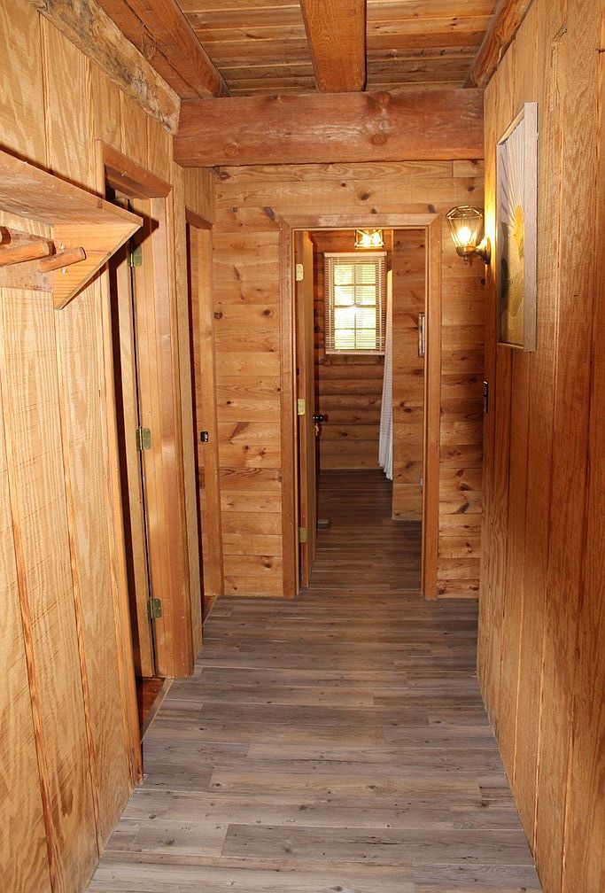 A narrow, rustic hallway features natural wood walls and warm wooden beams overhead, creating an inviting atmosphere. The floor is adorned with sleek, light-toned planks that contrast subtly with the darker wooden walls. Multiple doorways line the hall, each framed in wood, leading to various rooms, suggesting a utilitarian yet cozy layout. On the right side, soft ambient lighting from wall sconces adds warmth, reflecting off the wood and enhancing the rich textures. A hint of greenery from a small window at the end can be seen, contributing to the earthy feel of this historic space.