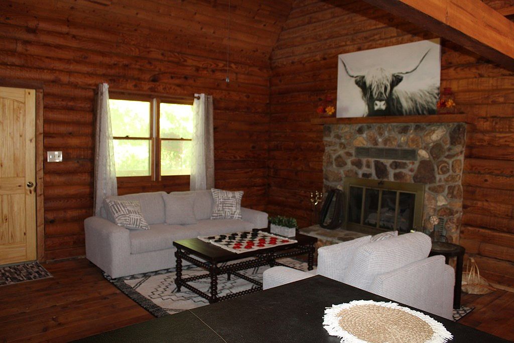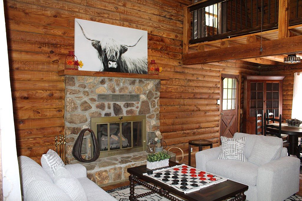 This living room features rustic wooden walls made of logs, contributing to a warm, cozy ambiance. A stone fireplace, prominently positioned, is flanked by two comfortable, light gray sofas adorned with subtle geometric patterns. Above the fireplace hangs a large black-and-white artwork of a Highland cow, adding a touch of modern charm. The coffee table is a rich dark wood, holding a classic checkers set that invites casual play. To the side, a dining area is visible, showcasing a wooden table and black chairs. Natural light filters through the large windows, enhancing the inviting atmosphere.