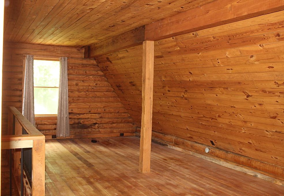 The loft area features exposed wooden beams and sloped ceilings, creating a rustic, cozy atmosphere. The warm tones of the wood, from the ceiling to the walls and flooring, evoke a sense of tranquility and connection to nature. Two large windows, adorned with light gray curtains, allow natural light to flood the space, enhancing its inviting nature. A wooden railing borders an open area, contributing to an airy feel. The absence of furniture emphasizes the loft’s spaciousness, inviting future design possibilities. This untouched area showcases traditional craftsmanship in a charming, historic setting.