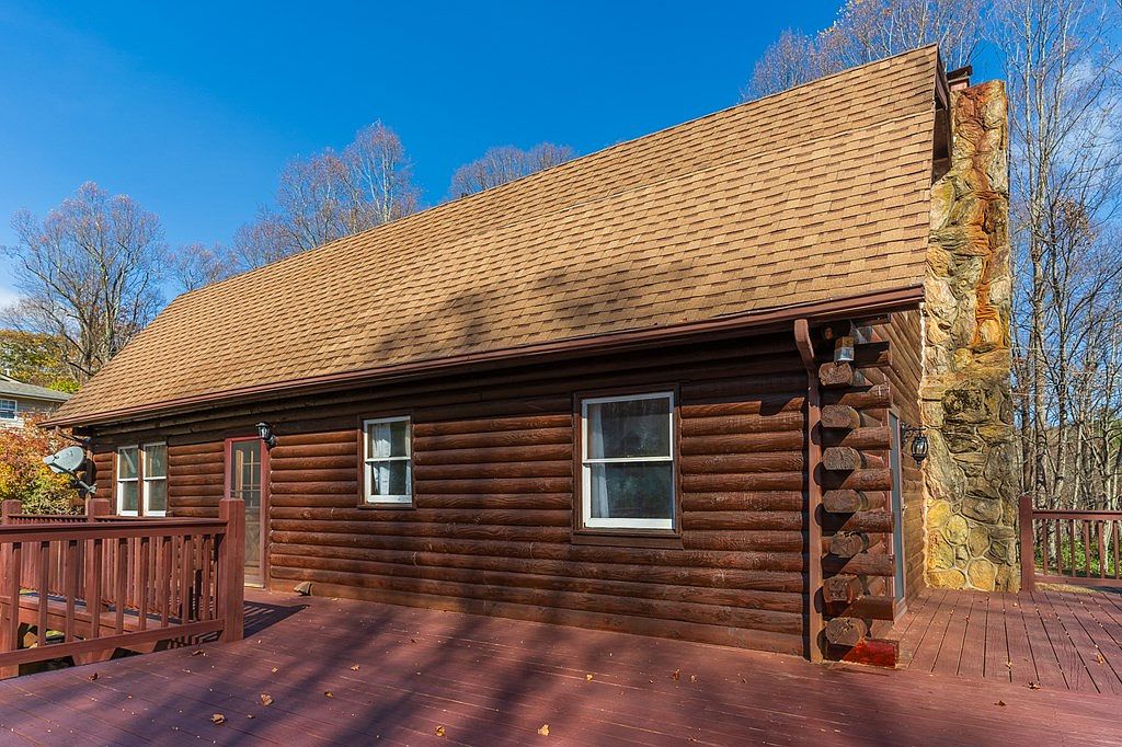 This image showcases the exterior of a rustic log cabin, characterized by its natural wood siding and a steeply pitched roof covered with asphalt shingles. The wooden logs exhibit a rich brown hue, enhancing the home’s connection to nature. A stone chimney emerges prominently from the side, adding texture and a focal point to the facade. The presence of white-framed windows contrasts with the dark wood, providing a hint of classic charm. A wooden deck extends outward, ideal for outdoor relaxation, while the surrounding trees in the background contribute to the serene, wooded setting.