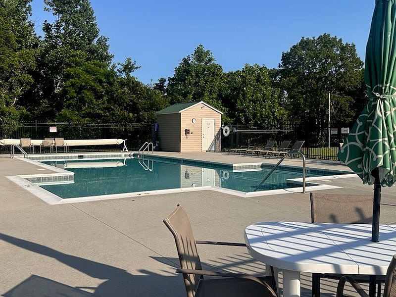 A clean, inviting swimming pool surrounded by a concrete deck creates a relaxing outdoor space. The pool features a clear blue water surface, reflecting the bright sky above. Adjacent to the pool are several lounge chairs, perfect for sunbathing, their neutral tones complementing the soft gray of the deck. A small, light green shed stands nearby, adding a touch of color while providing storage for pool items. A round table with light-colored chairs offers a spot for refreshments. Lush greenery lines the background, enhancing the serene atmosphere and creating a peaceful retreat feel.