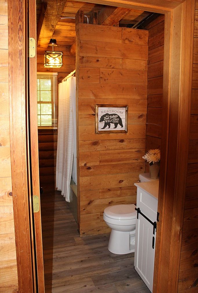 A cozy bathroom with rustic charm, featuring warm wooden walls and ceiling beams that enhance the cabin aesthetic. The flooring showcases a textured, natural wood look, contributing to the inviting atmosphere. On the right, a crisp white vanity with a black handle complements a compact toilet, creating a clean contrast against the wooden backdrop. A charming sign stating “RESTROOM” adorns the wall, invoking a friendly ambiance. Light filtering through a window illuminates the space gently, while a vintage lantern hangs from the ceiling, providing a soft glow. The sheer shower curtain hints at practicality while maintaining openness.