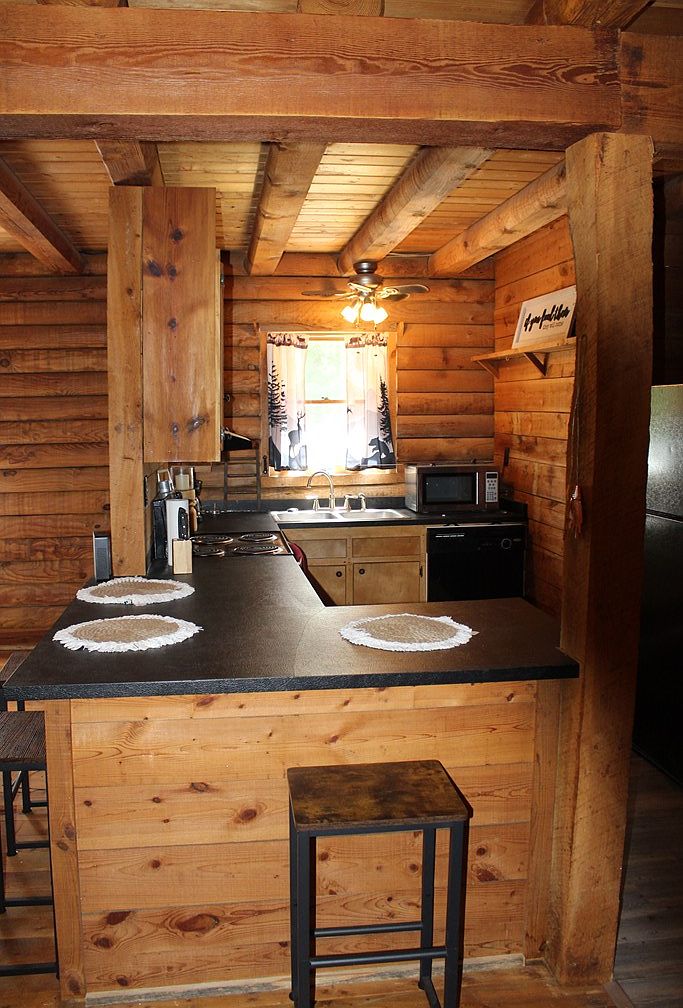 This rustic kitchen features warm wooden beams and logs forming the walls, creating a cozy, cabin-like atmosphere. The color palette consists of rich browns from the wood, complemented by a sleek black countertop. A central island with seating is equipped with placemats, inviting casual meals. The cabinetry is light brown, offering a warm contrast, while stainless steel appliances add modern convenience. A window adorned with simple, nature-themed curtains allows natural light to enhance the inviting space. The ceiling fan adds a functional element, balancing the rustic charm with contemporary amenities for a cheerful cooking environment.