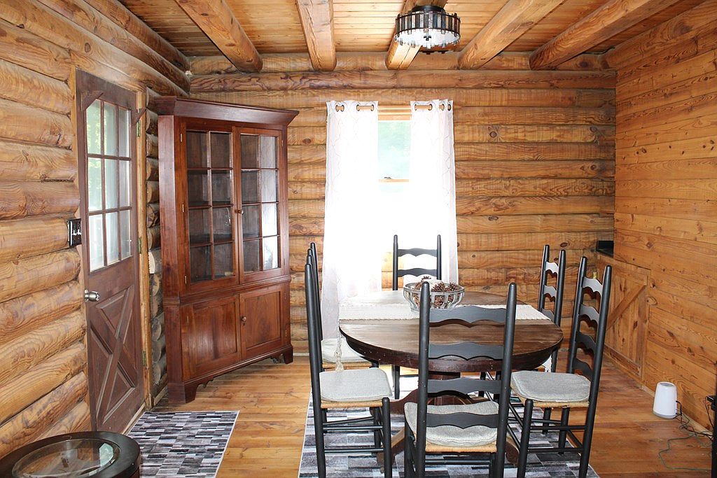 This cozy dining area features exposed log walls that enhance its rustic charm. A dark wooden table occupies the center, surrounded by six tall, black chairs with a unique curved backrest design. A decorative table runner adds elegance, while a bowl of natural decor centers the table. Soft light filters through sheer white curtains adorning a window, illuminating the warm wood tones. A glass-fronted cabinet rests against the wall, showcasing any dishware or decor. The flooring is honey-toned wood with a patterned rug under the table, enhancing the inviting atmosphere of this intimate space.
