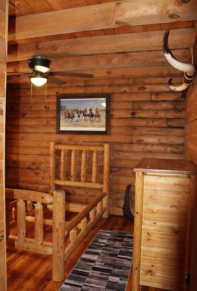A rustic bedroom features log cabin aesthetics, highlighted by wooden walls and ceiling beams. The bed is crafted from thick logs, exhibiting a natural finish that complements the room’s warmth. A wooden nightstand stands beside the bed, adding functionality. A southwestern-themed artwork depicting cowboys on horseback hangs above the bed, enhancing the western charm. A ceiling fan rotates softly, providing comfort. The hardwood floor is accented by a patterned area rug in gray and black, offering visual contrast. The overall ambiance is cozy and inviting, perfect for a serene retreat, showcasing a connection to nature and simplicity.