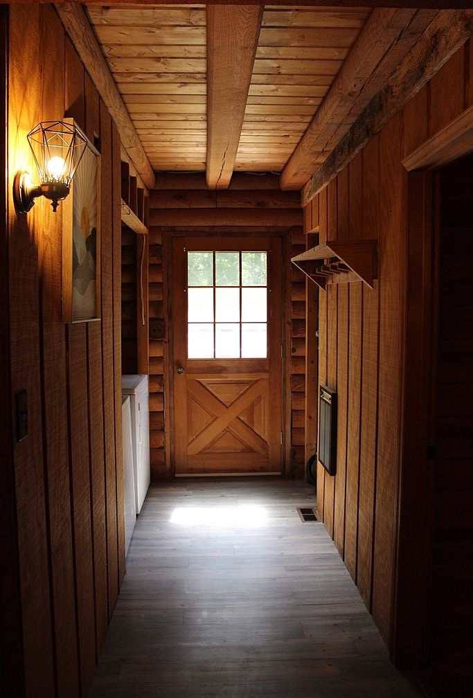 A rustic hallway features wooden walls and beams, creating a warm, inviting ambiance. Natural wood tones dominate, with the ceiling showcasing exposed beams and planks, enhancing the cabin-like feel. To the left, a simple light fixture casts a soft glow, illuminating a piece of wall art. At the end, a double-paned, rustic wooden door with a diamond pattern is framed by natural light. The floor showcases gray wood-like tiles, blending modernity with the historic charm. To the right, a discreet shelf adds functionality without detracting from the cozy atmosphere, complemented by subtle architectural details.