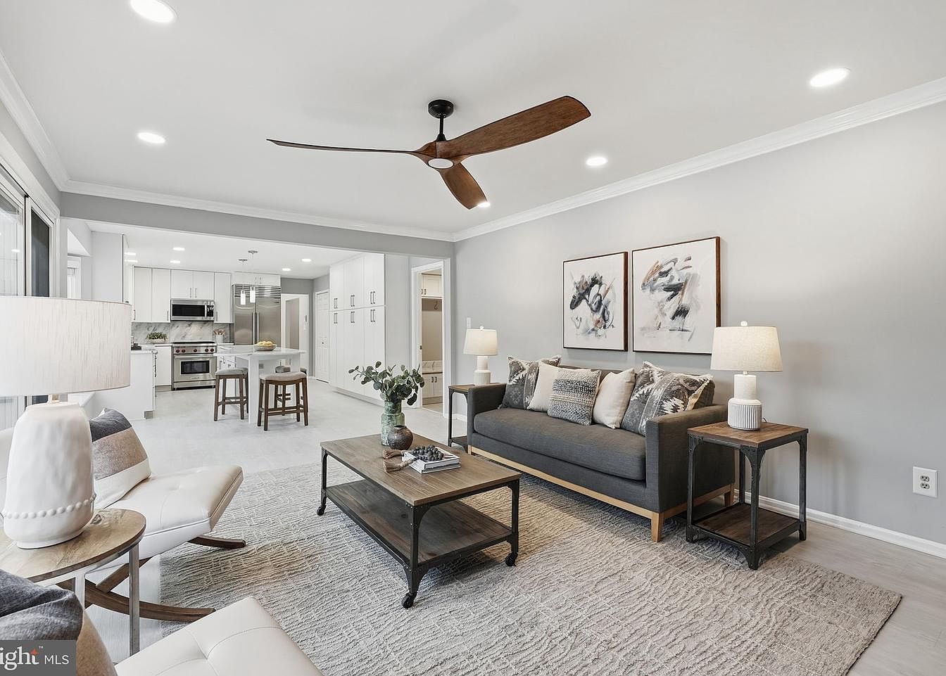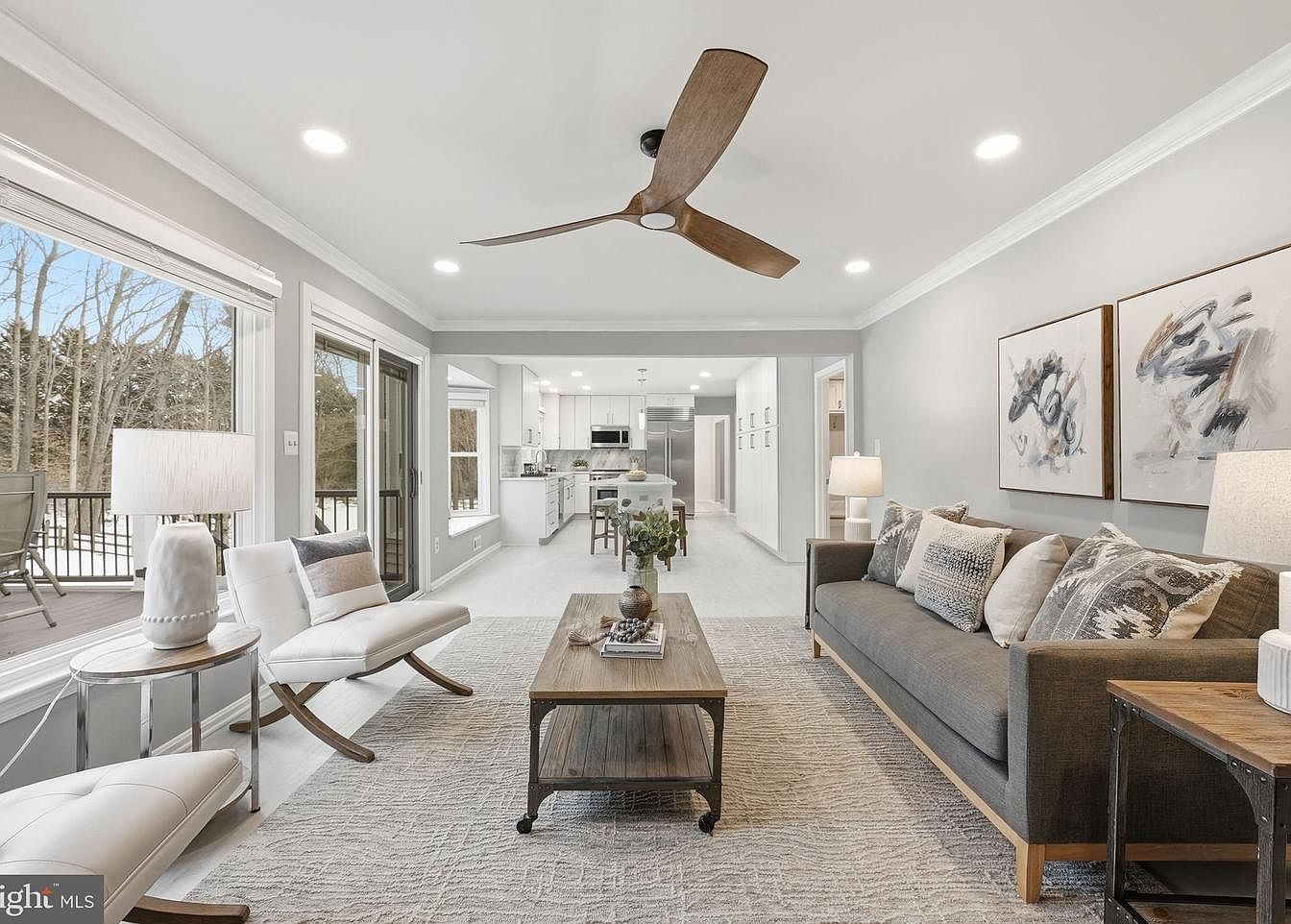 A spacious living room featuring an open layout, seamlessly connecting to the kitchen area. The walls are a soft gray, enhancing the bright, airy feel. Large windows allow natural light to flood in, showcasing surrounding greenery. A modern ceiling fan contrasts with traditional elements like crown molding. A plush gray sofa adorned with patterned throw pillows faces a rustic wooden coffee table, which rests on a textured area rug. To one side, a stylish accent chair complements a sleek side table with a contemporary lamp. Art pieces with abstract designs add a touch of sophistication, enriching the decor.
