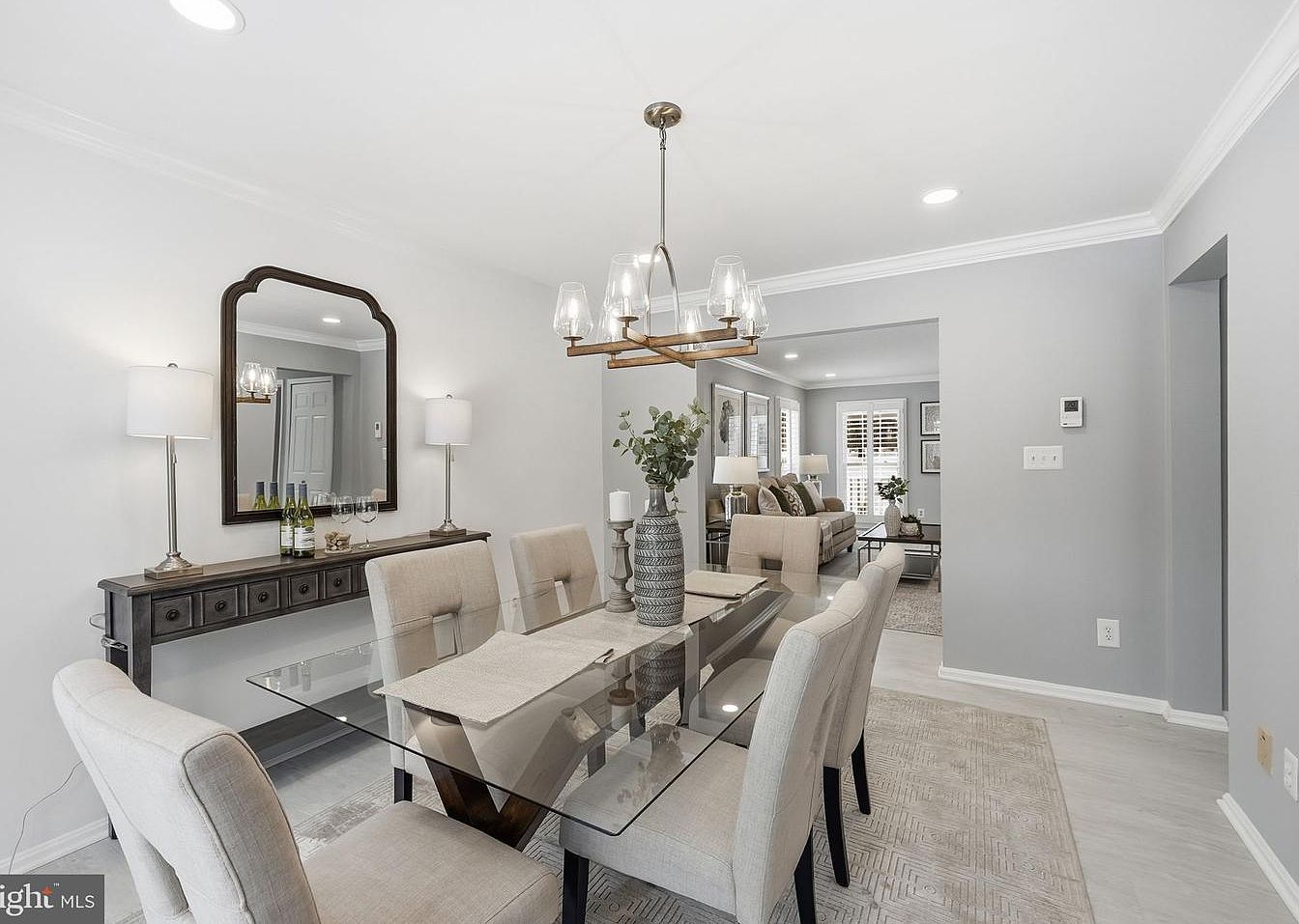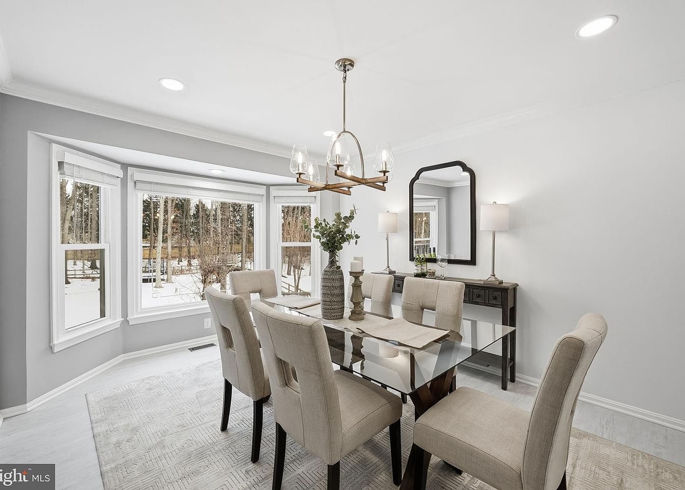 A bright dining area features a sophisticated glass table surrounded by beige upholstered chairs. The walls are a soft gray, contrasting nicely with the white ceiling and trim. Large bay windows allow natural light to flood the space, offering a view of the winter landscape outside. A stylish chandelier hangs above the table, illuminating the setting. A sleek console table with decorative items adds elegance, while a large mirror enhances the sense of space. Textured rugs underfoot add warmth, creating an inviting atmosphere ideal for gatherings or intimate meals.