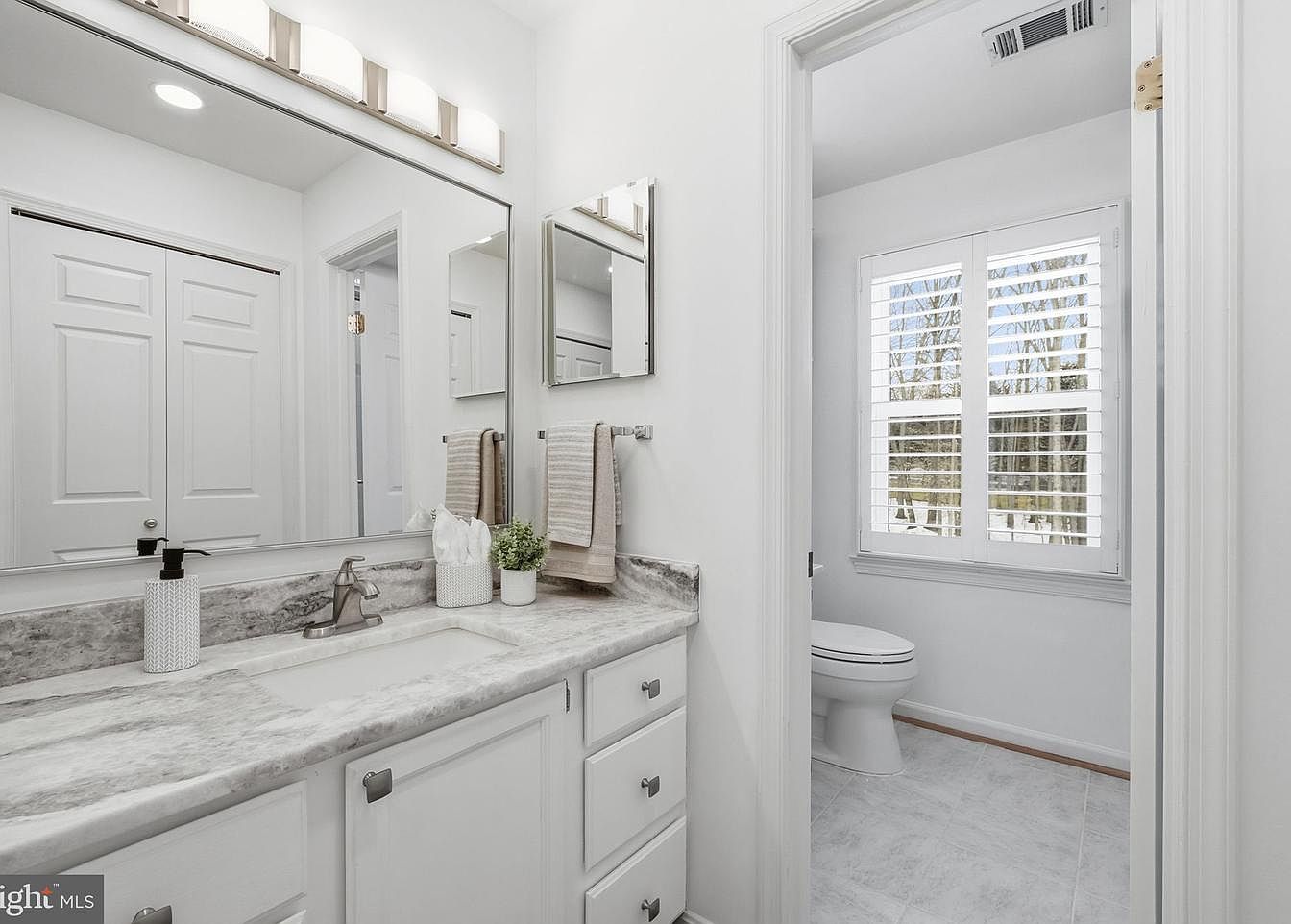 This bathroom features a sleek, modern design centered around a white and gray color scheme. A spacious vanity hosts a polished marble countertop, paired with a contemporary faucet and a stylish soap dispenser. Above the sink, two mirrors reflect the bright, natural light streaming through a window adorned with plantation shutters. The room’s lighting is enhanced by a chic fixture, providing a warm glow. Adjacent to the vanity, a clean, minimalist toilet is positioned strategically for both functionality and aesthetics. Light, neutral tiles complete the flooring, enhancing the overall airy and fresh ambiance of the space.