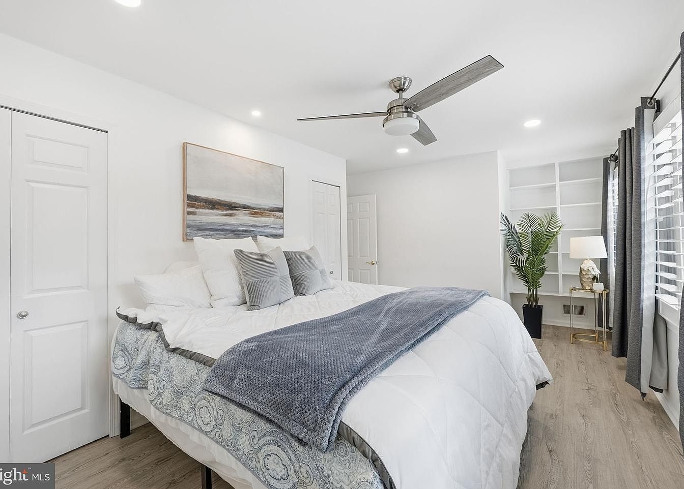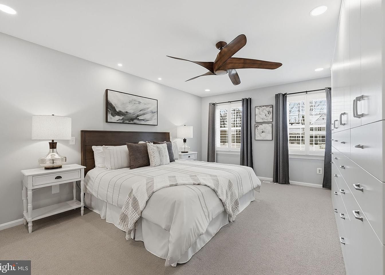 This cozy bedroom features a neutral color palette of whites and grays, complemented by natural wood accents. A large, neatly made bed with plush pillows and a cozy throw blanket is the focal point. Beside the bed, a stylish white nightstand holds a contemporary lamp with a metallic finish. A sleek dresser lines the wall, offering ample storage. Large windows adorned with elegant gray curtains invite natural light, enhancing the serene atmosphere. Artwork above the bed adds a touch of sophistication, while recessed lighting and a modern ceiling fan create a comfortable ambiance.