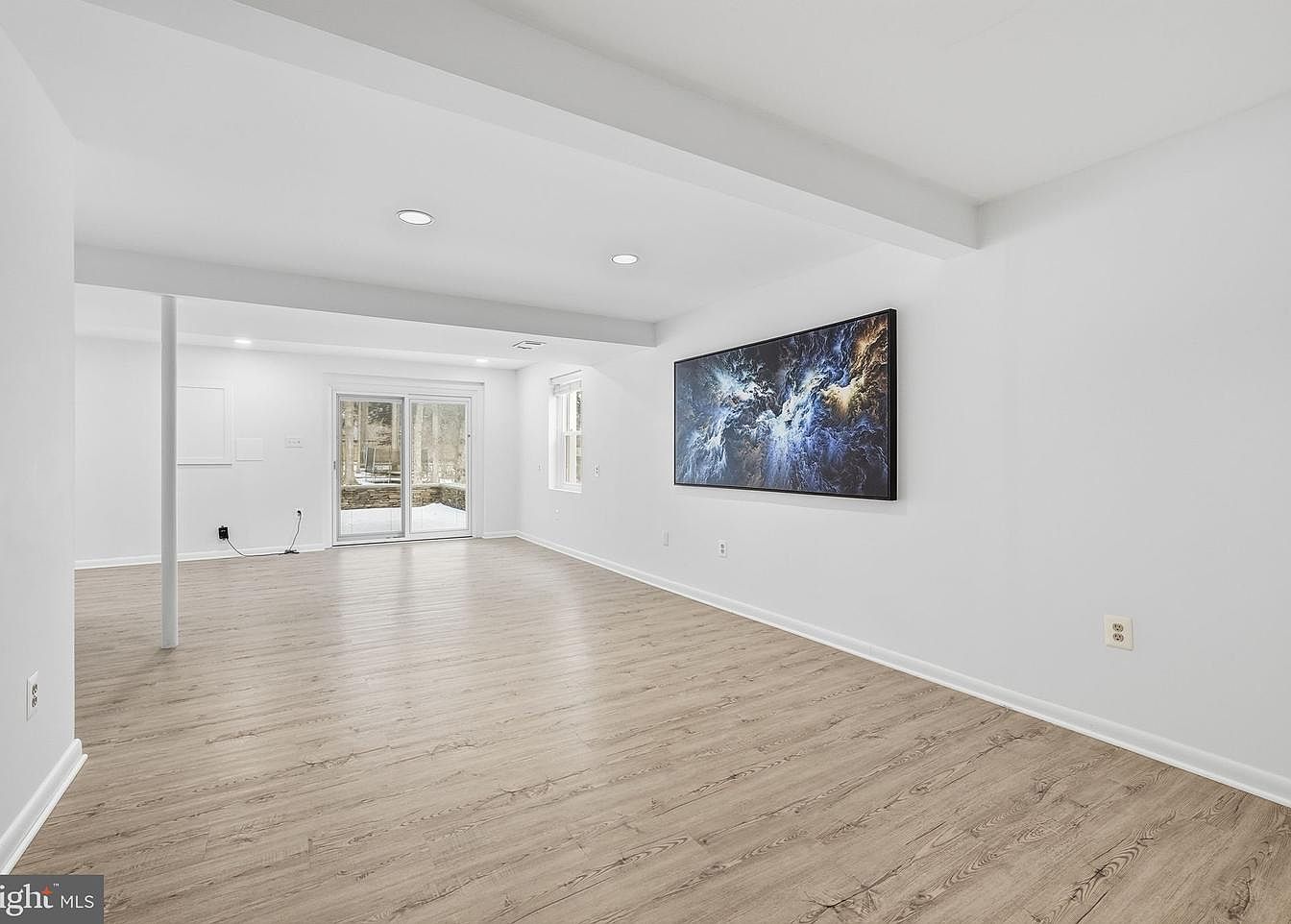 A spacious living room features a warm, natural wood-like floor that extends across the room. Clean white walls create a bright and airy atmosphere, complemented by recessed ceiling lights that enhance the overall luminosity. A large, vibrant piece of abstract art adorns one wall, providing a striking contrast to the minimalist decor. On the far side, sliding glass doors invite natural light and offer a view of the outdoor landscape, seamlessly connecting the interior to nature. The layout is open and uncluttered, allowing for flexible furnishing options and promoting a relaxed, inviting ambiance.