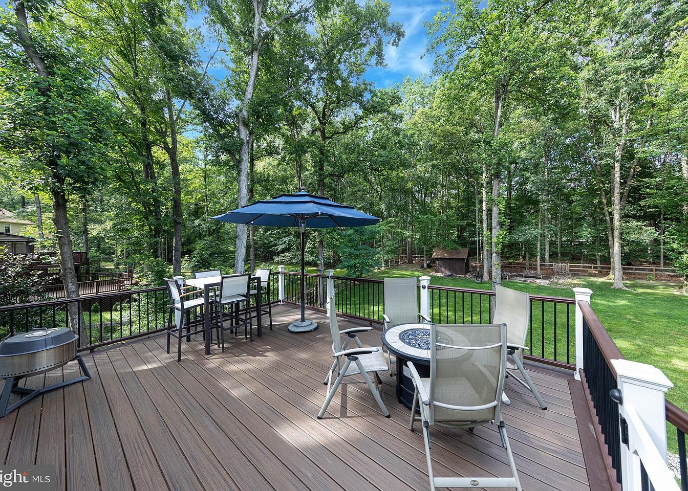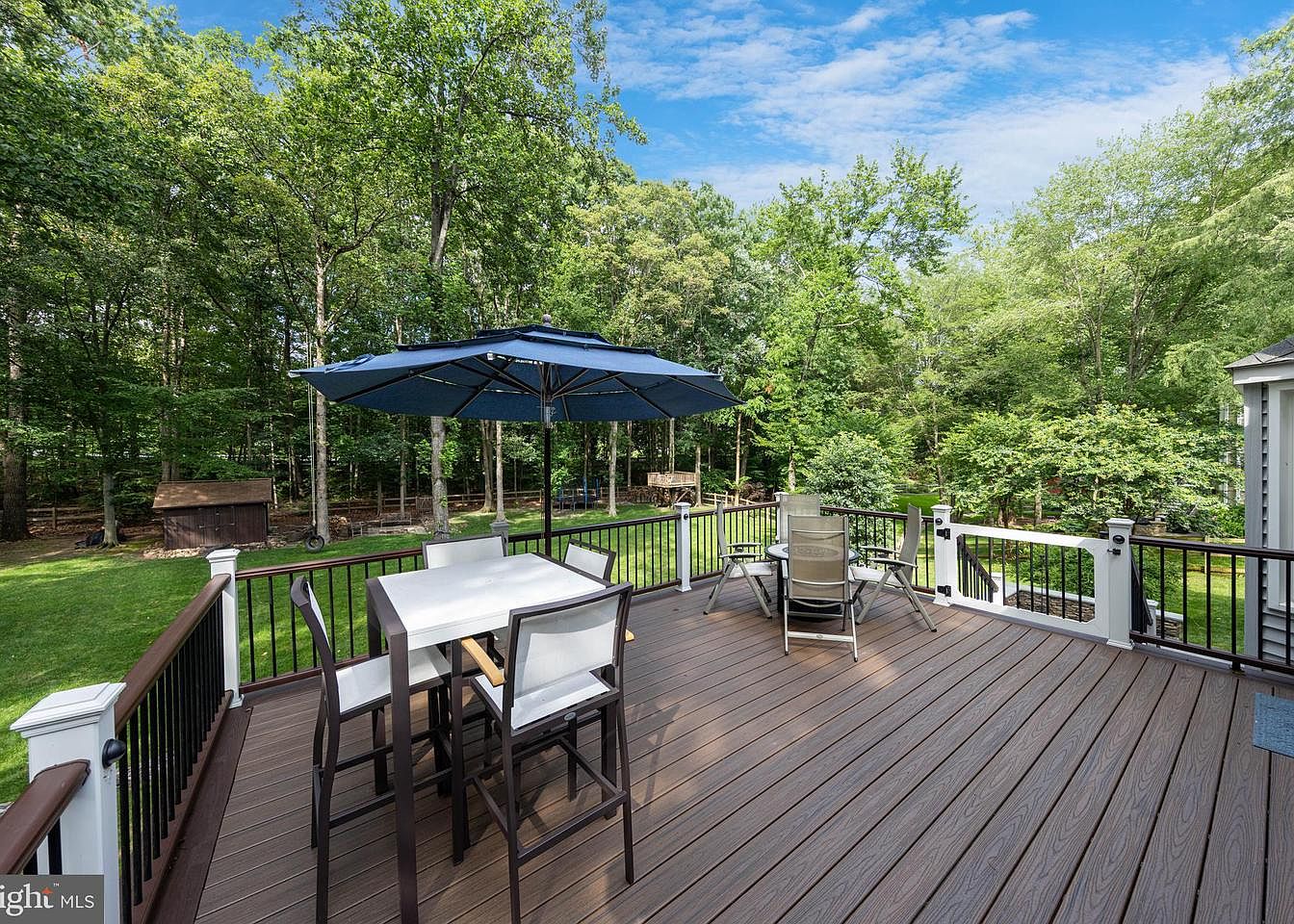 This outdoor deck features a spacious layout with composite flooring and a railing that enhances safety while offering unobstructed views of the lush, green surroundings. A central round table is complemented by four chairs, encouraging social gatherings, while a tall bar table with seating enhances the entertaining aspect. A large navy umbrella provides shade, balancing functionality with style. The backdrop of towering trees creates a serene atmosphere, seamlessly blending nature with the home’s architecture. Sunlight filters through the foliage, casting pleasant patterns on the deck, inviting relaxation and outdoor enjoyment.