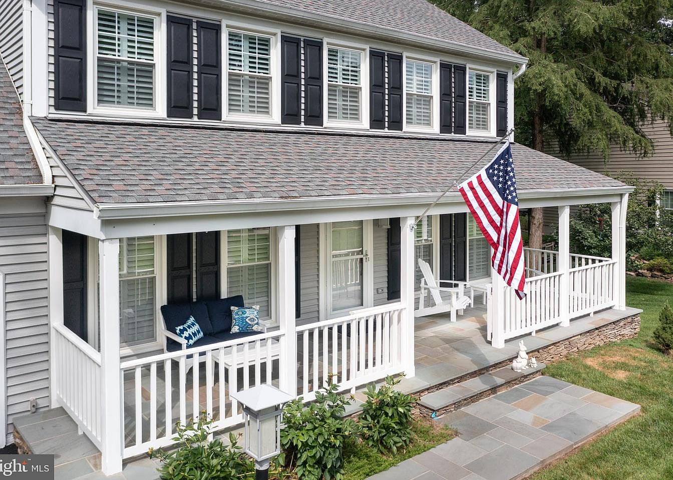 A welcoming front porch features a symmetrical layout with a well-maintained stone pathway leading to a white railing. The porch is adorned with navy blue cushions and decorative throw pillows on a white bench, providing a cozy seating area. Architectural elements include classic black window shutters flanking multiple window panes, enhancing curb appeal. An American flag waves proudly above, symbolizing patriotic charm. The slate tiles underfoot add a rustic touch, while lush greenery and flowerbeds frame the entrance, creating an inviting atmosphere. The overall color scheme combines soft neutrals with navy and white accents for an elegant yet approachable design.