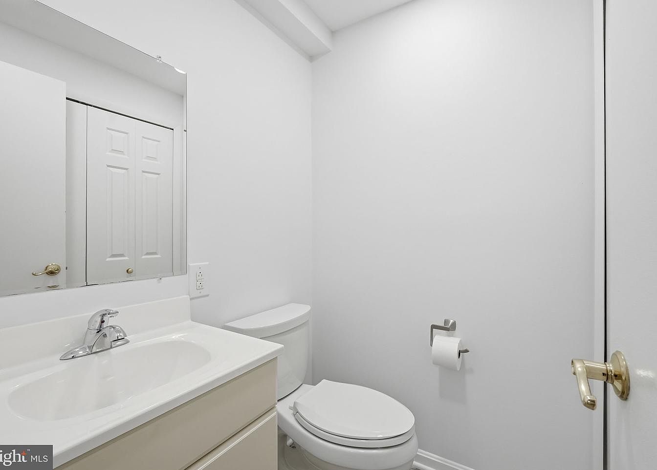 This compact powder room features a minimalist design. The walls are painted a crisp white, creating a bright and airy atmosphere. A single white vanity with a sleek countertop and an integrated sink provides functionality while maintaining a clean aesthetic. The mirror above the sink enhances the sense of space, reflecting light and the simple elegance of the room. To the right, a modern toilet is positioned, complemented by a nearby toilet roll holder in brushed metal. A door leads to a small closet, seamlessly blending into the wall. The overall look is fresh and contemporary.