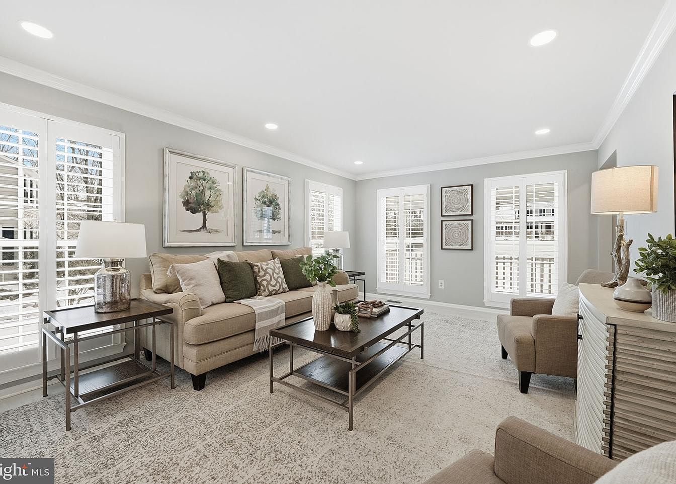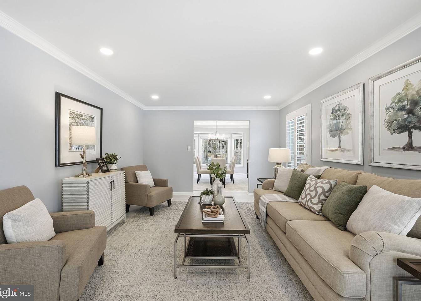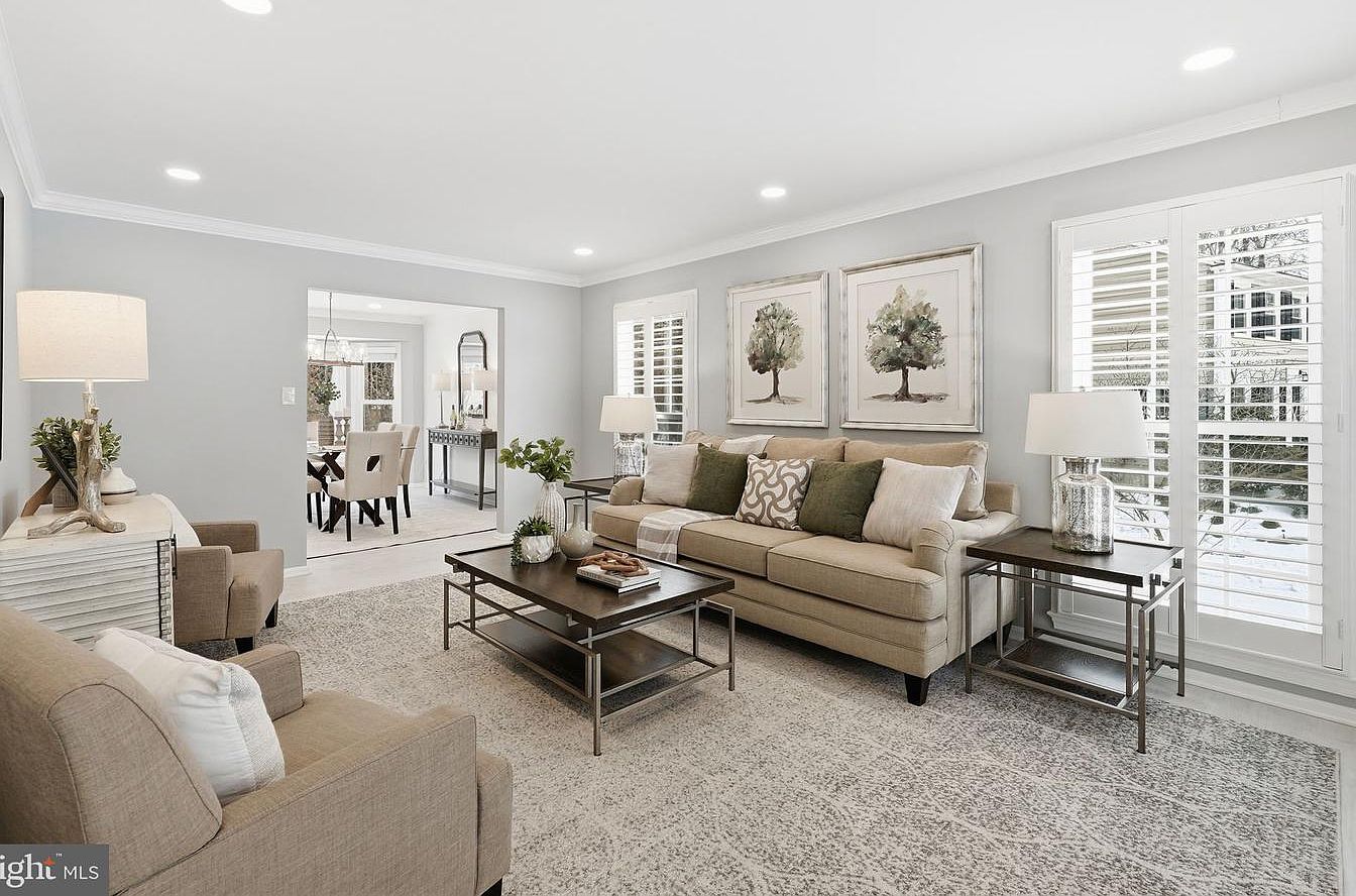 This inviting living room features a neutral color palette with soft gray walls and light beige furnishings. A plush sofa adorned with various throw pillows offers comfort, complemented by an accent chair in a similar tone. A stylish coffee table with a dark wood finish sits atop a textured area rug, providing a cozy focal point. Two large framed artworks featuring trees hang elegantly on the wall, enhancing the natural theme. The light filtering through plantation shutters adds warmth, while recessed lighting brightens the space. An adjoining room is visible, enhancing the open layout.