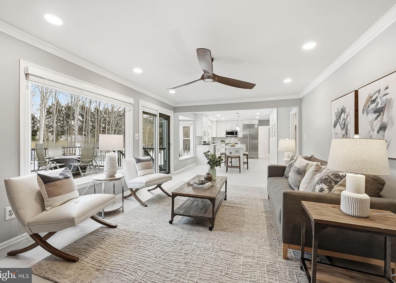 This living room features an open layout with large windows, filling the space with natural light. The soft gray walls enhance the airy feel, while a plush area rug grounds the seating arrangement. A contemporary gray sofa, adorned with patterned pillows, faces two elegant white armchairs. A rustic wooden coffee table adds warmth, complemented by decorative accents, like a plant and books. A sleek ceiling fan contrasts with the modern decor. Through the adjoining room, a modern kitchen is visible, showcasing white cabinetry and stainless steel appliances, creating a seamless transition between entertainment areas.
