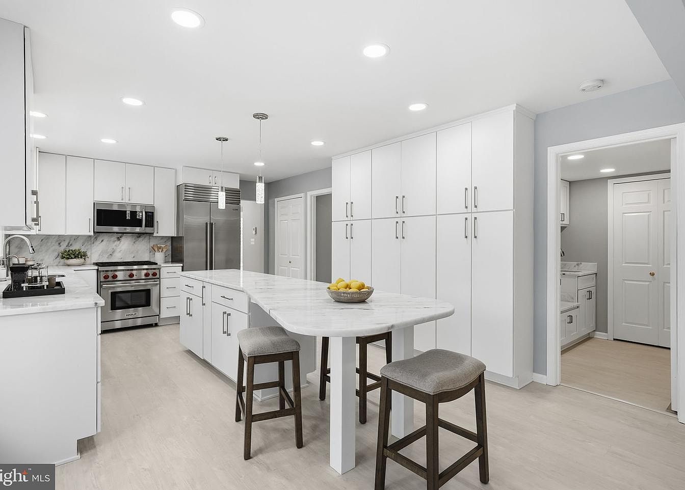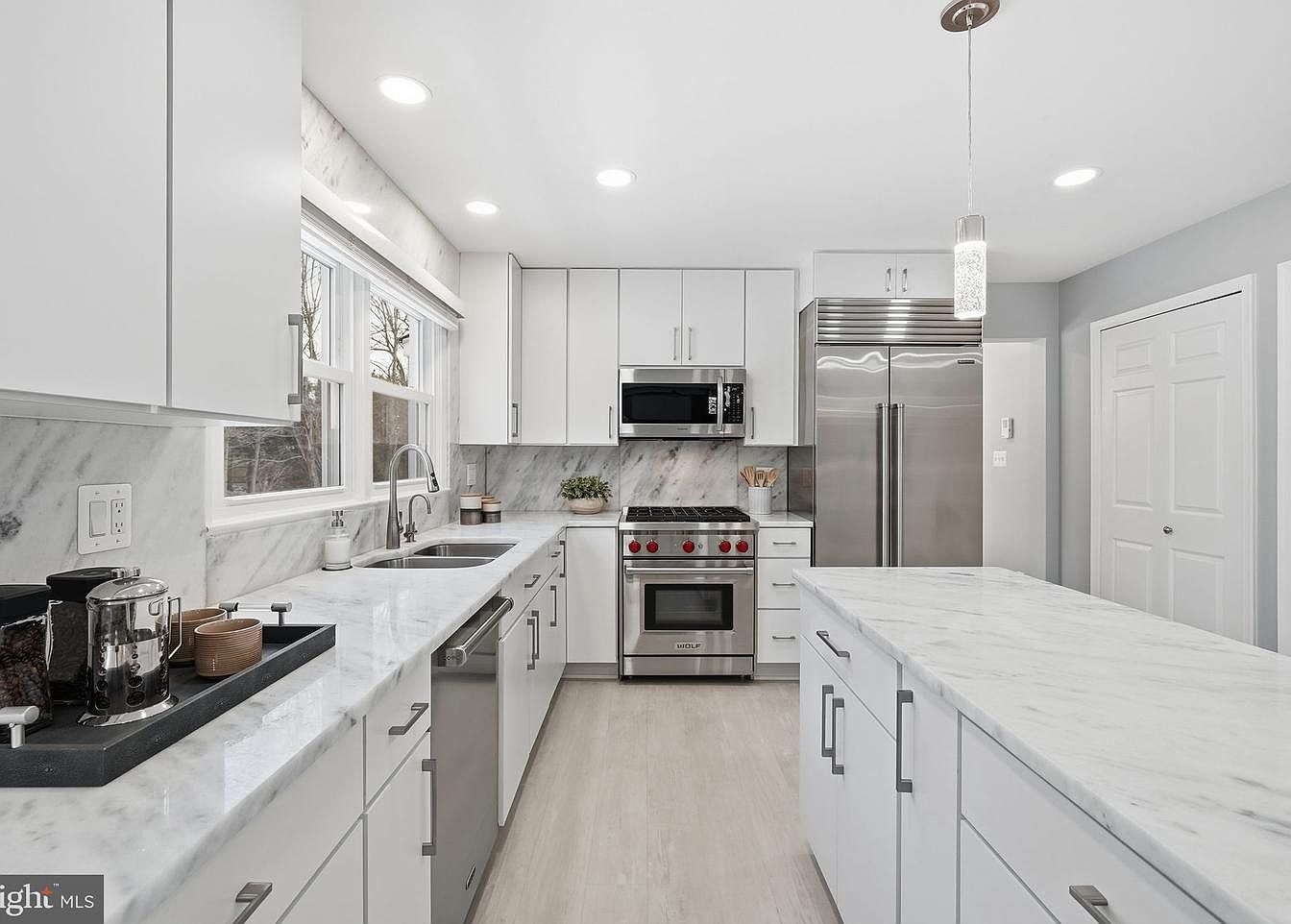 This modern kitchen showcases a clean and sleek design with white cabinetry and elegant marble countertops. The countertops feature subtle gray veining, complementing the minimalist aesthetic. Stainless steel appliances, including a large oven and dual refrigerator, enhance functionality and style. Ample natural light floods in through the windows, illuminating the space. A contemporary pendant light hangs above the island, adding a touch of elegance. The layout is open and airy, with a harmonious flow between the cooking and prep areas. Decorative elements, such as potted herbs and stylish kitchenware, bring warmth and vibrancy to the scene.