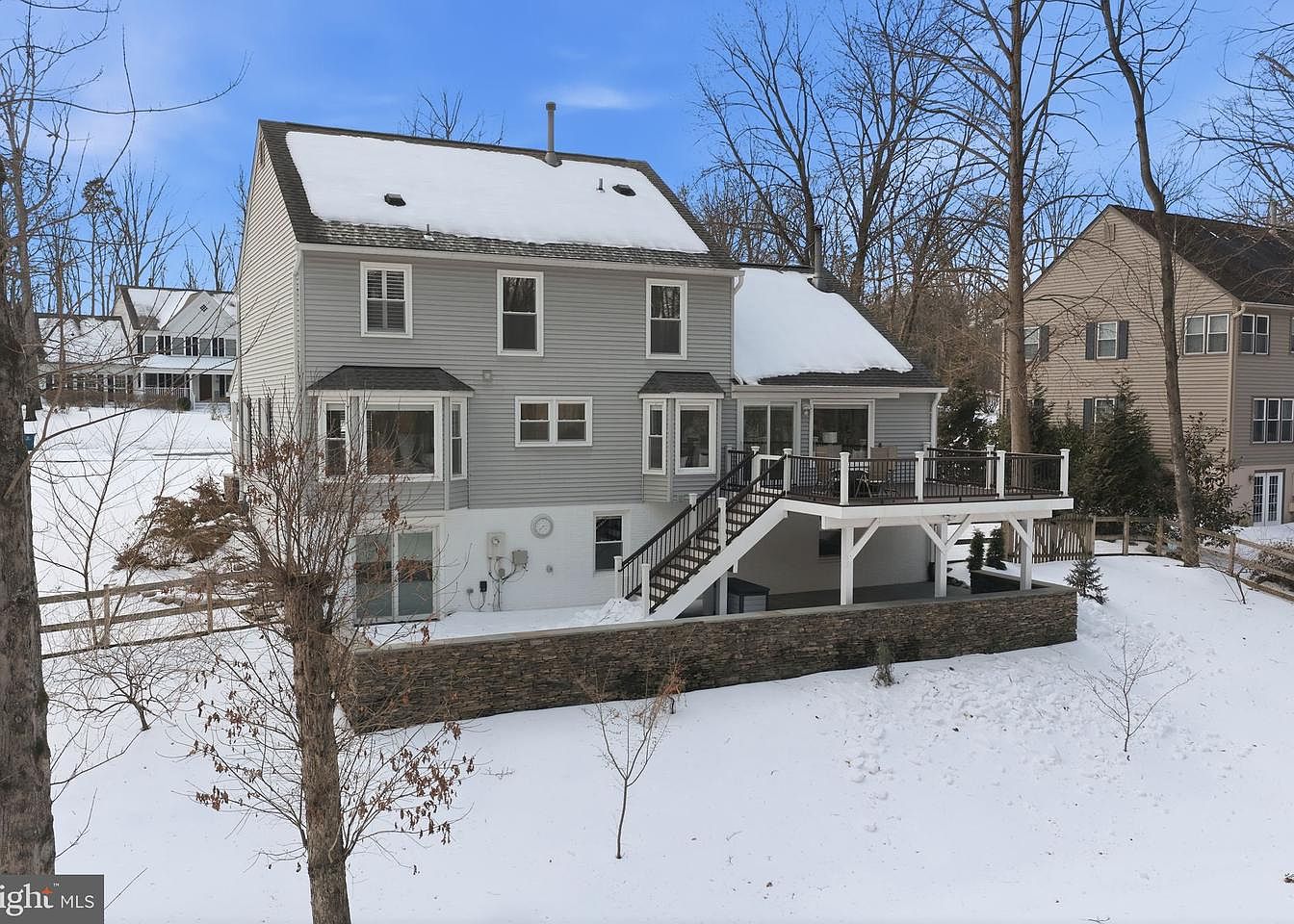 The image captures the rear view of a contemporary home surrounded by snow. The multi-story structure features a combination of light gray siding and a stone base, adding warmth and texture. A prominent deck extends from the upper level, supported by white columns, offering a smooth contrast to the natural stone below. The deck railing showcases a classic black finish, framing the outdoor space nicely. Large windows allow natural light to flood in, while the snow-covered yard hints at winter charm. Leafless trees in the background create a serene backdrop, enhancing the peaceful ambiance of this residential setting.