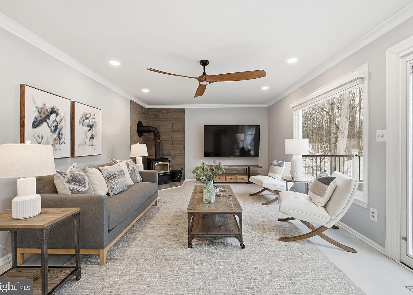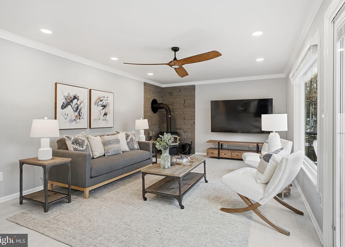 This space features a cozy, modern living room with a contemporary color scheme of soft grays and earthy tones. A plush gray sofa adorned with decorative pillows creates a comfortable seating area. A rustic wooden coffee table anchors the room, complemented by a stylish area rug. The wall features abstract art, adding character, while a sleek mounted television provides entertainment. A unique ceiling fan enhances air circulation, and a vintage-style stove adds warmth. Large windows invite natural light, showcasing a serene view of trees outside. The overall design balances comfort and elegance, perfect for relaxation and gatherings.