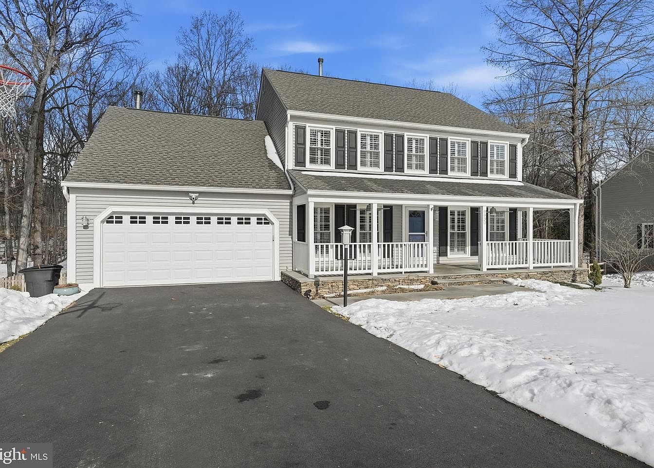 This welcoming front entry showcases a classic two-story American home. The light gray siding contrasts beautifully with dark gray shutters on multiple windows, offering a timeless color scheme. A spacious porch with white railings invites relaxation, while stone accents along the foundation enhance its rustic charm. The parking area features a smooth asphalt driveway leading to a white garage door adorned with decorative windows. Snow lightly covers the ground, creating a serene winter landscape. Tall trees in the background provide a natural frame, ensuring the home blends harmoniously with its environment.