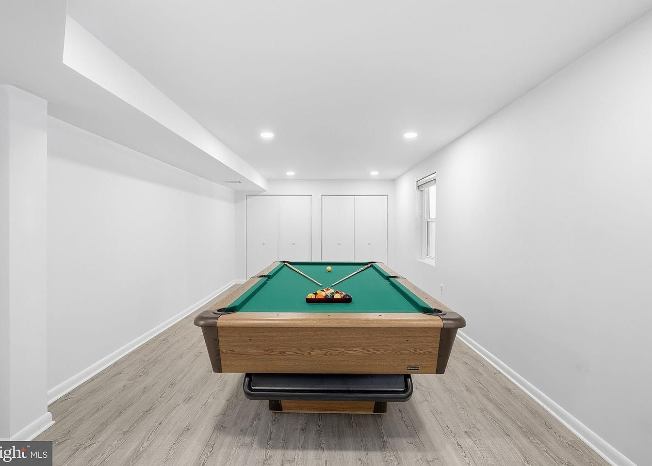 This game room features a spacious layout with a billiard table as the central element, adorned with a vibrant green felt surface. Light wood finishes dominate the table, providing a warm contrast against the stark white walls and ceiling. Recessed lighting illuminates the space, enhancing its modern feel. To the left, double closets offer concealed storage, while a window on the right allows natural light to stream in. The flooring is light-colored laminate, complementing the minimalist aesthetic—creating an inviting atmosphere perfect for recreation and relaxation.