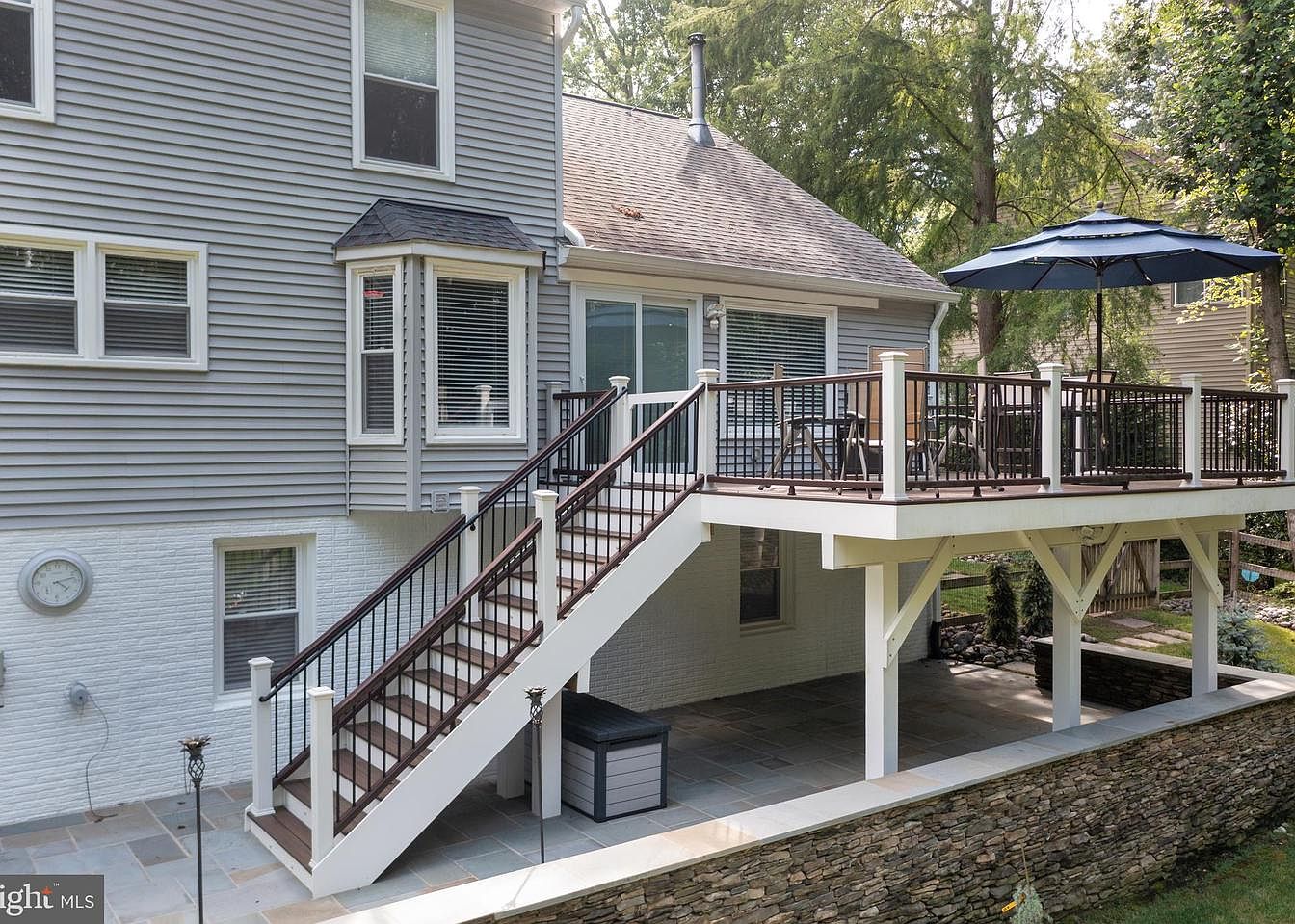 A two-level deck enhances this stylish home’s exterior, featuring a blend of light and dark materials. The upper deck is bordered by dark wooden railings that create an inviting space under a large navy umbrella, complemented by a metal table and chairs for outdoor dining. Beneath, a slate-tiled patio offers a smooth transition to the ground level, while stone accents provide a rustic touch. The house showcases a mix of vertical and horizontal siding, painted in soft gray tones. Large windows with blinds ensure both light and privacy, while a wall clock adds a functional detail.
