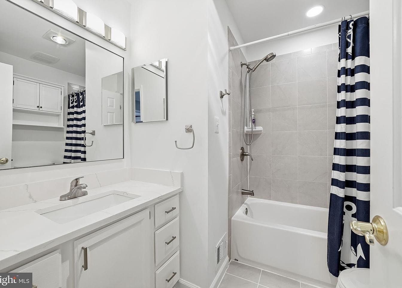 This bathroom blends modern design with functionality. The crisp white color palette creates a clean and spacious feel. A sleek, white vanity with polished marble countertop and stylish hardware offers ample storage beneath. A large mirror reflects light, enhancing brightness. The shower area features large gray tiles, complemented by a nautical-themed shower curtain with navy and white stripes. A bath tub rests beside the shower, inviting relaxation. Modern lighting fixtures provide illumination while maintaining an uncluttered aesthetic. Chrome fixtures add a contemporary touch, showcasing a harmony of elegance and practicality throughout this well-appointed space.