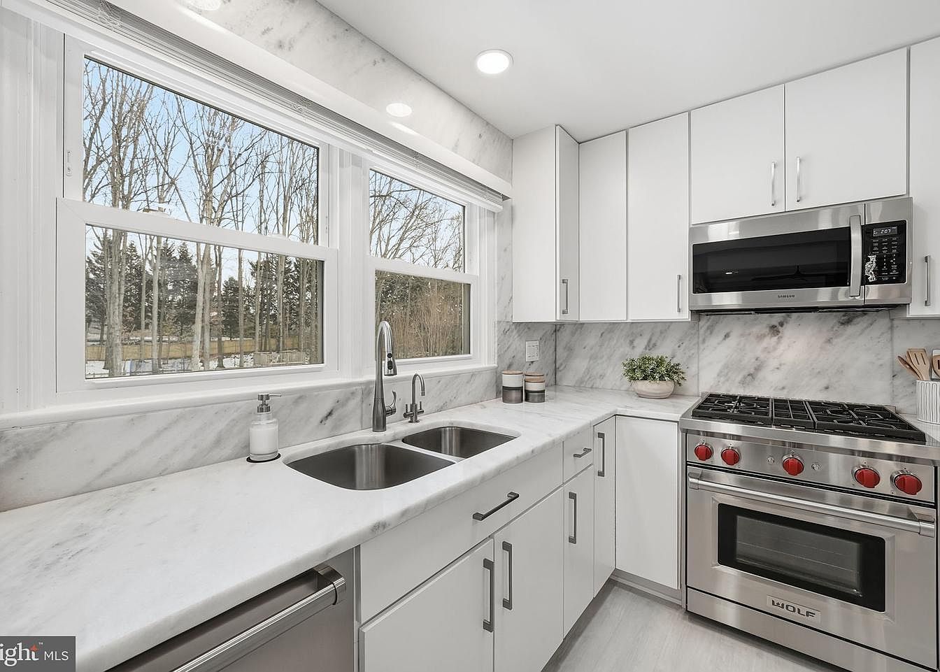 This modern kitchen features sleek white cabinetry and elegant marble countertops. The minimalist design is accentuated by stainless steel appliances, including a professional-grade gas range and microwave. Abundant natural light floods the space through large windows, offering a view of the serene outdoor environment. The color scheme is predominantly white, creating a bright and airy atmosphere, while the gray tones in the marble add sophistication. Practical elements like the dual sink and understated hardware elevate usability. Decorative touches include potted plants and neatly arranged kitchen items, blending functionality with a touch of personalization.