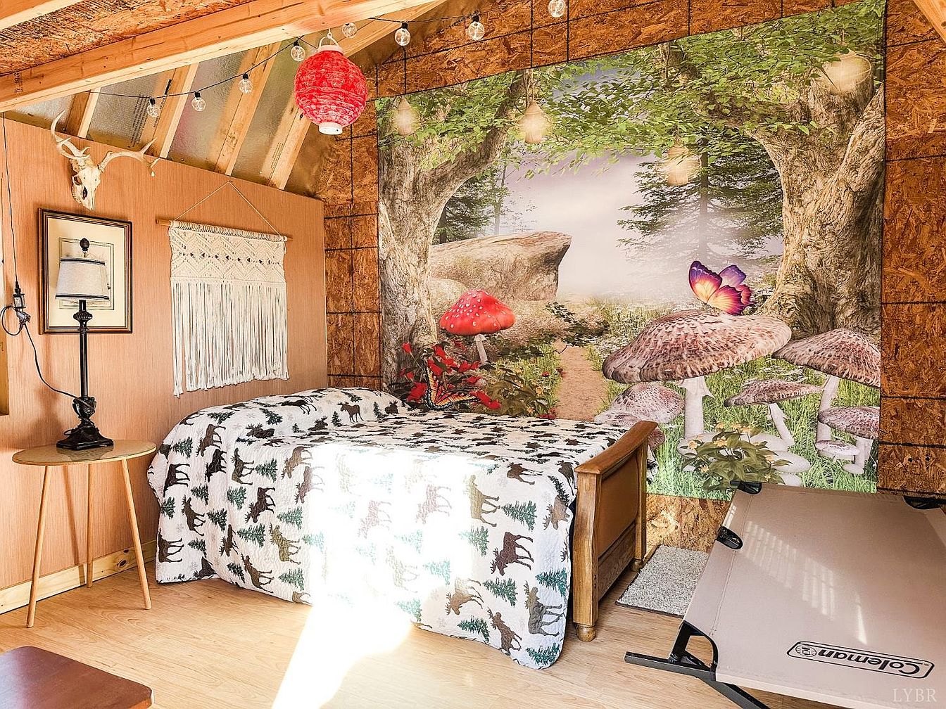 This small, rustic bedroom features warm wooden accents and charming decorations. The walls are a blend of natural wood and a large mural showcasing a whimsical forest scene with mushrooms and a butterfly, creating an inviting atmosphere. A soft, nature-inspired quilt with deer motifs covers the bed, enhancing the outdoorsy feel. A round side table with a black base supports a lamp, providing soft illumination. A macramé wall hanging and a framed picture add texture and charm. Ambient string lights complement the cozy aesthetic, while a portable cot sits unobtrusively, reflecting a multifunctional space.