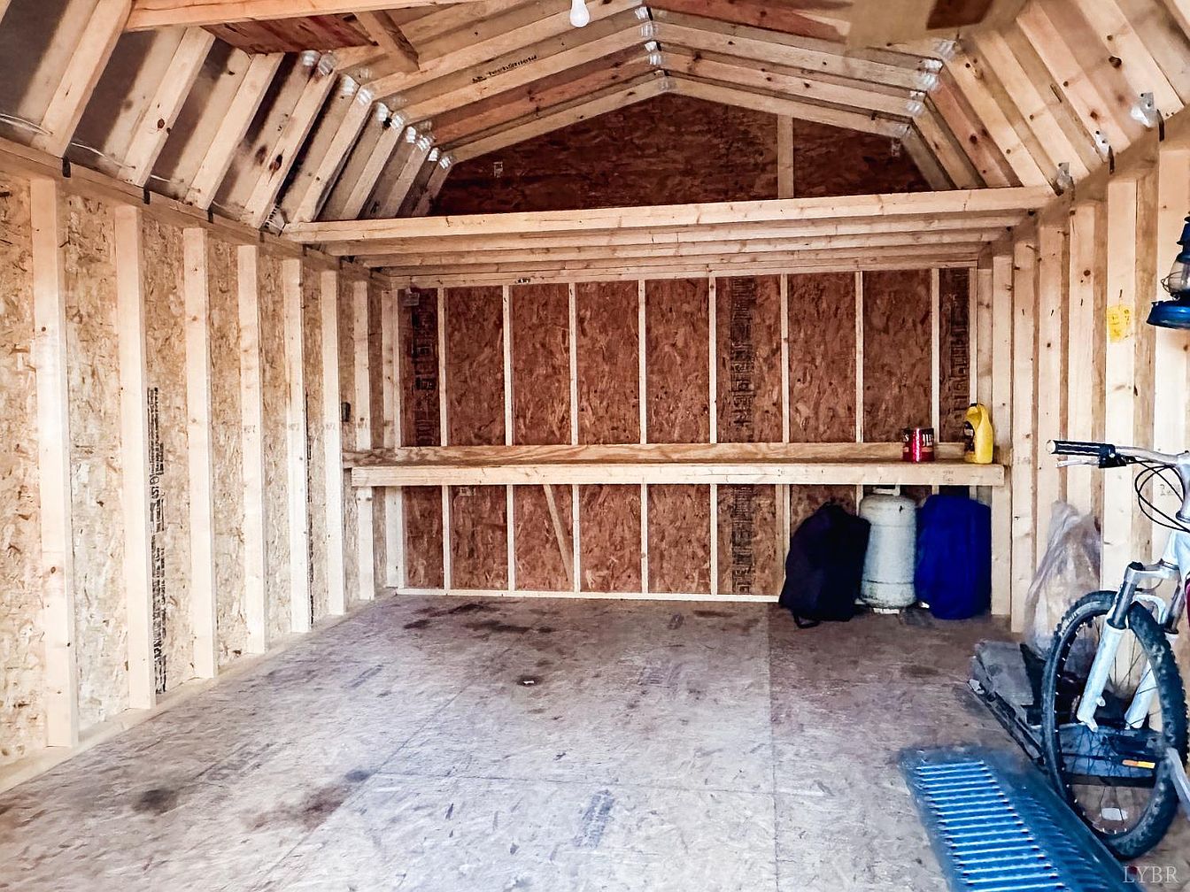 The space features a bare wooden structure with exposed beams, highlighting a rustic aesthetic. The walls are lined with oriented strand board, giving a natural yet unfinished look. A long, sturdy wooden shelf runs along the back wall, providing ample storage for tools or other items. The floor is made of plywood and shows evidence of wear, indicating frequent use. A bicycle leans against the side, while bags and containers are positioned in the corners. The lighting consists of a few bright bulbs hanging from the ceiling, illuminating the area and adding functionality to this utilitarian shed.
