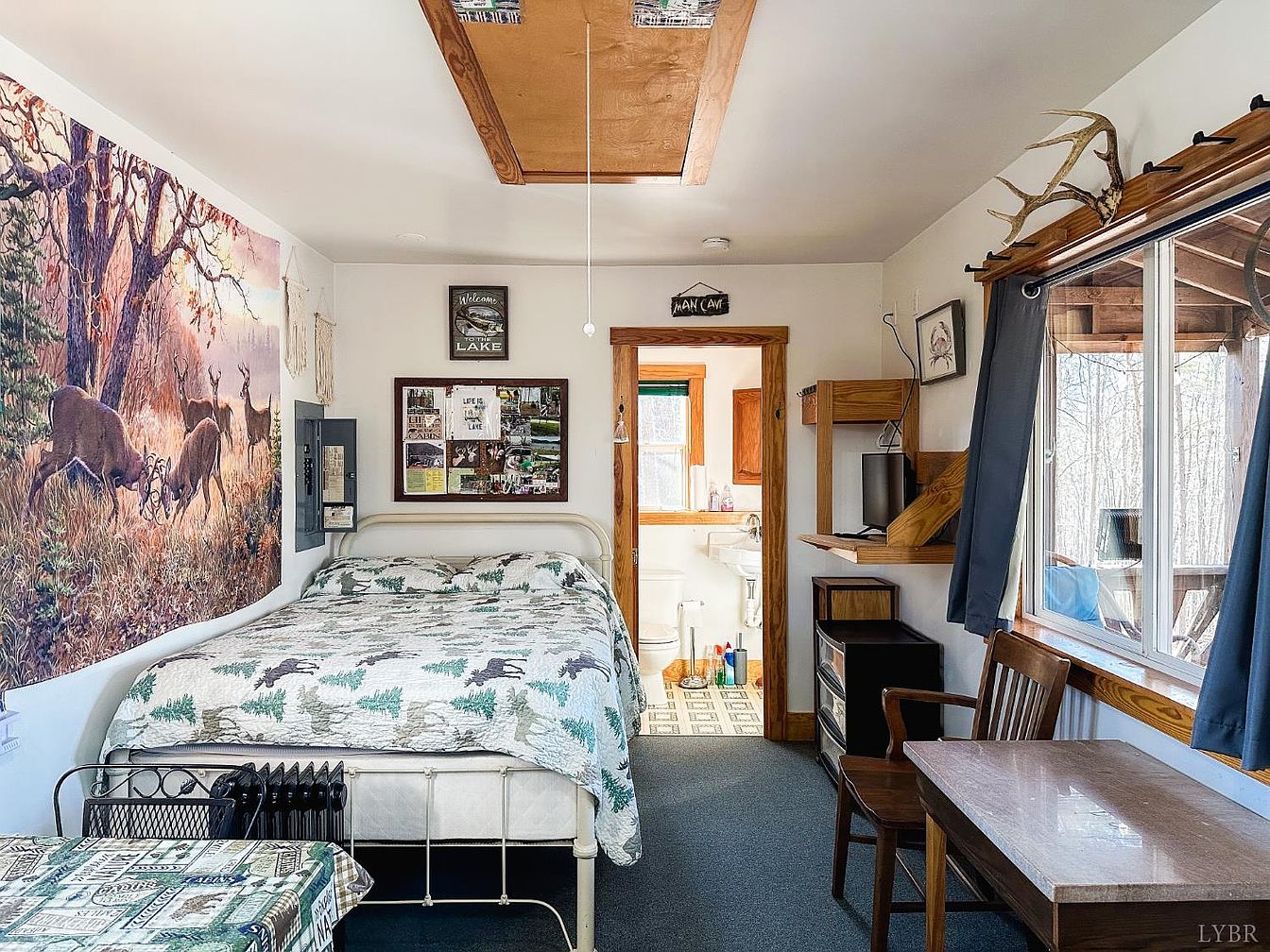 This cozy bedroom features a rustic aesthetic with nature-themed decor. A photographic mural of deer in a forest sets a serene backdrop. The bed, adorned with a tree-patterned quilt, complements the earthy tones. A small dining table with a patterned tablecloth invites relaxation, while a wooden desk offers a functional workspace. The room’s wooden accents, including the ceiling beams and window frames, enhance its warmth. Dark curtains drape over large windows, allowing natural light to filter in. A variety of personal memorabilia and decor on the walls add character, creating a welcoming and homely atmosphere.