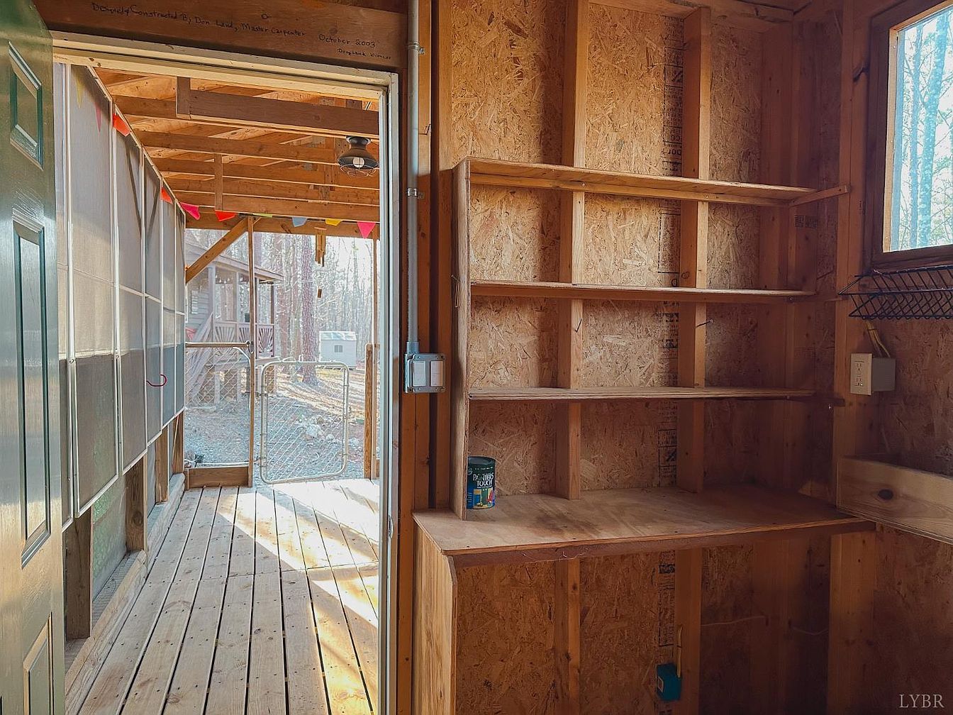The utility room features a simple, functional layout with exposed wooden walls, showcasing natural textures. A sturdy wooden shelf runs along one side, ideal for storage or organizing supplies. A green door leads to the exterior, providing a rustic touch. Looking outside, sunlight streams through a mesh screen, creating a bright ambiance. The space opens to a small deck with a railing and an entrance to a fenced area. The wooden flooring is practical and complements the overall natural aesthetic, tying in with the wooden architecture while offering a glimpse of the surrounding wooded landscape.