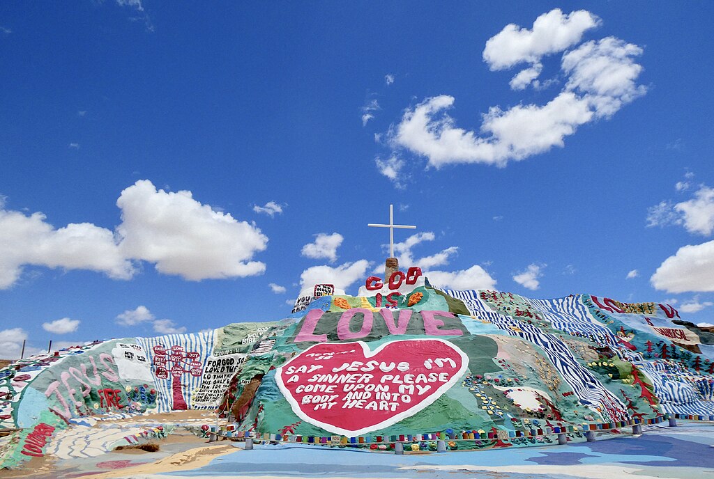 Salvation Mountain is a vibrant, hand-painted adobe hill created by Leonard Knight to spread messages of love and faith. Over decades, Knight covered the mountain with colorful murals, Bible verses, and symbols, turning it into a spiritual art installation. Located in the Colorado Desert, the bright colors contrast sharply with the surrounding sand, creating a striking visual spectacle. Visitors often walk its paths, take photos, and explore nearby desert attractions. Salvation Mountain stands as a heartfelt testament to personal vision and persistence.