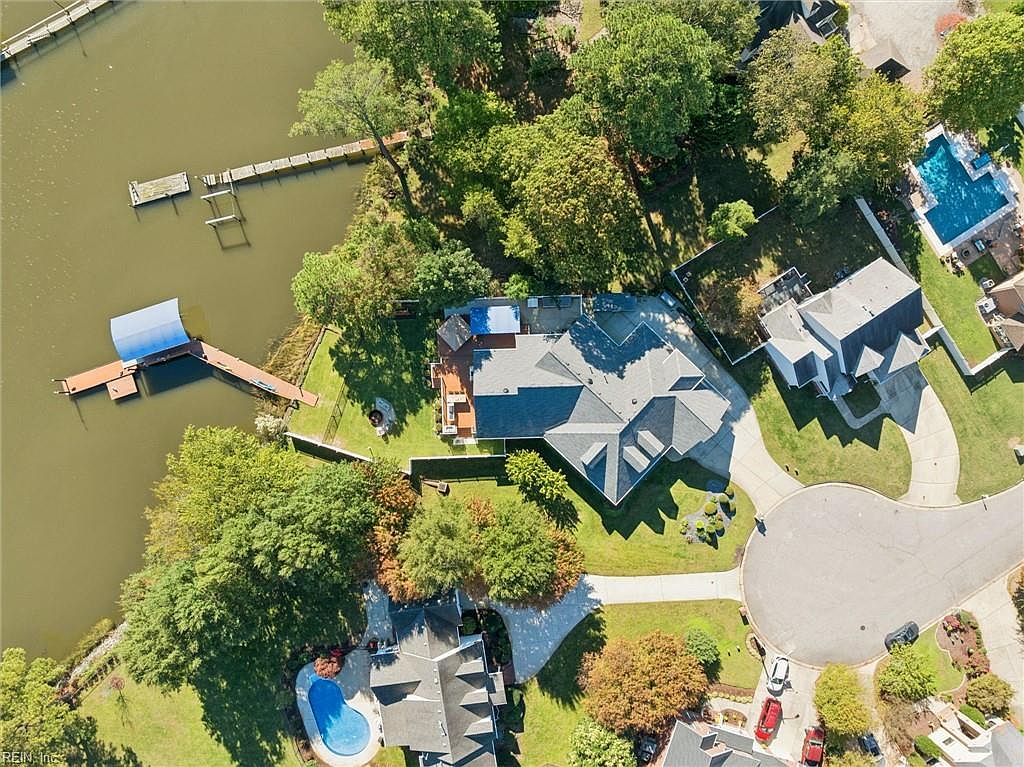 An expansive aerial view showcases a harmonious blend of residential and natural elements. The layout features several homes surrounding a tranquil body of water, with green landscaping enhancing the scenery. The rooftops exhibit varied designs, predominantly featuring muted gray tiles. A dock extends into the water, highlighted by a blue cover that provides shade. Nearby, a circular driveway and multiple trees create an inviting atmosphere. In the upper right corner, a swimming pool sparkles under sunlight, reflecting its vibrant blue hue. The arrangement illustrates a peaceful suburban lifestyle intertwined with waterfront leisure.
