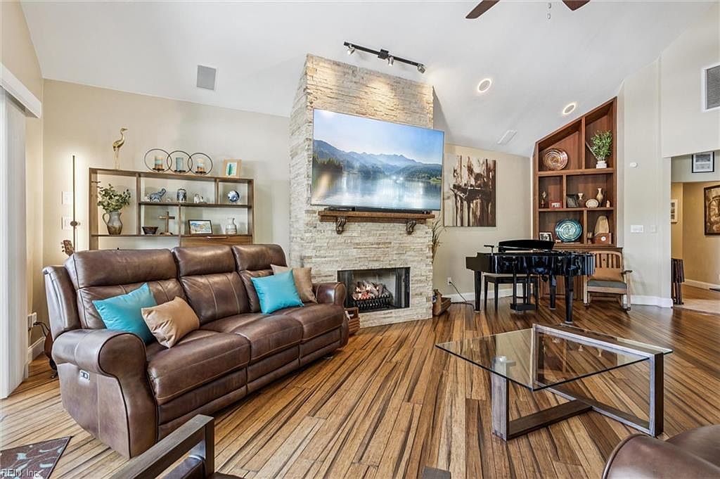 A spacious living room features a prominent stone fireplace against a light-colored wall, accentuated by a large flat-screen TV above it. A rich, brown leather sectional sofa, adorned with turquoise cushions, invites relaxation. Wood flooring with varying tones creates warmth, complemented by a contemporary glass coffee table with geometric design. Brightly lit, with vaulted ceilings and recessed lighting, the space feels airy and open. A sleek black grand piano sits elegantly in the corner, near a decorative wooden bookshelf filled with art and plants, enhancing the room’s aesthetic with a blend of modern and traditional elements.