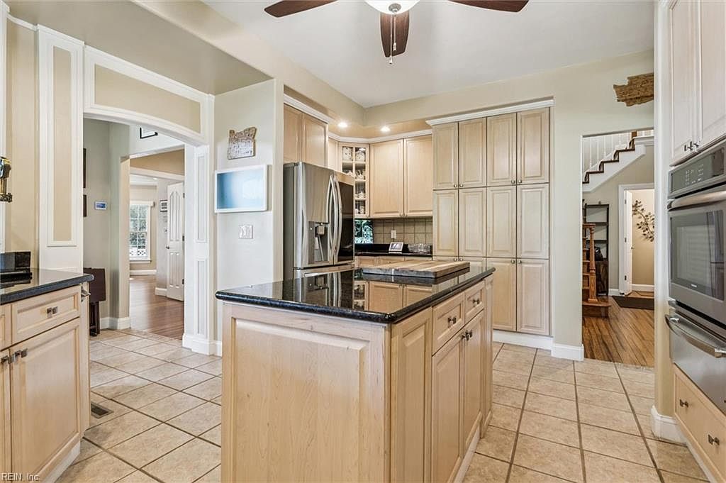 This modern kitchen features an open layout with ample storage. Light maple cabinetry contrasts beautifully against the dark granite countertop, creating a warm yet elegant atmosphere. The tiled floor presents a neutral backdrop that complements the color scheme. Stainless steel appliances, including a double oven, add a sleek, contemporary touch. A ceiling fan circulates air, enhancing comfort. An archway leads to a cozy nook visible beyond, suggesting a seamless transition between spaces. The layout maximizes functionality, offering a central island for meal prep. Natural light filters in through nearby windows, brightening the area and inviting a cheerful ambiance.