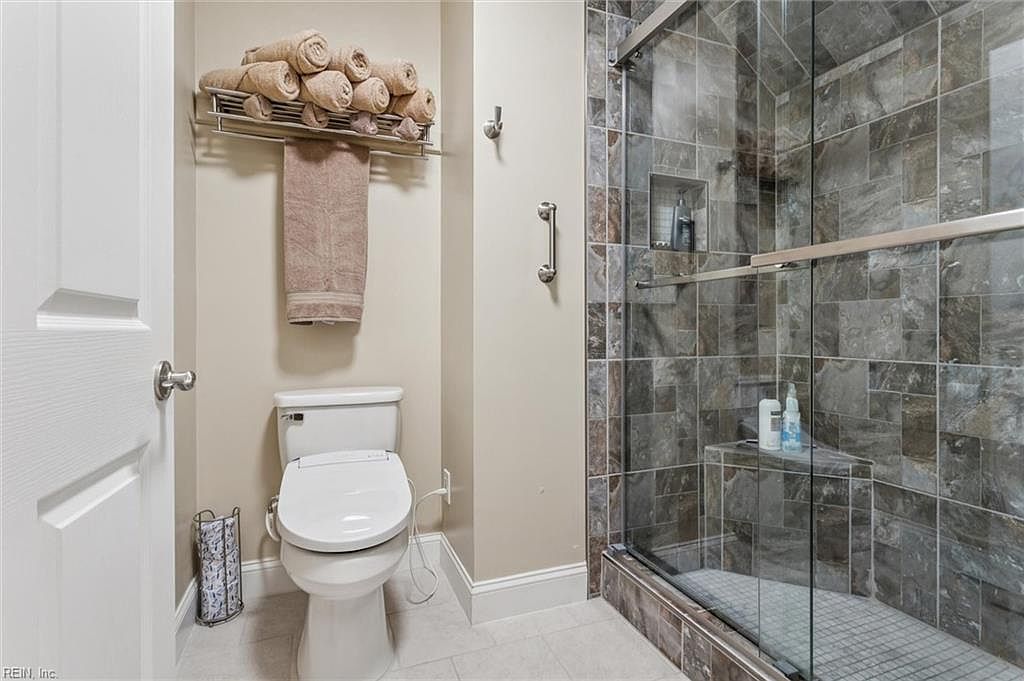 A compact bathroom features a modern design with a glass shower enclosure showcasing stylish stone tiles in earthy gray tones. The color palette combines soft beige walls with darker tiles, creating a warm yet sophisticated atmosphere. A clean, white toilet is positioned beside a sleek towel rack, which holds neatly rolled towels, adding a touch of organization and comfort. The floor is adorned with large, light-colored tiles that enhance the room’s spaciousness. Simple chrome fixtures complement the contemporary style, while a built-in niche in the shower provides practical storage for toiletries, ensuring a functional space.