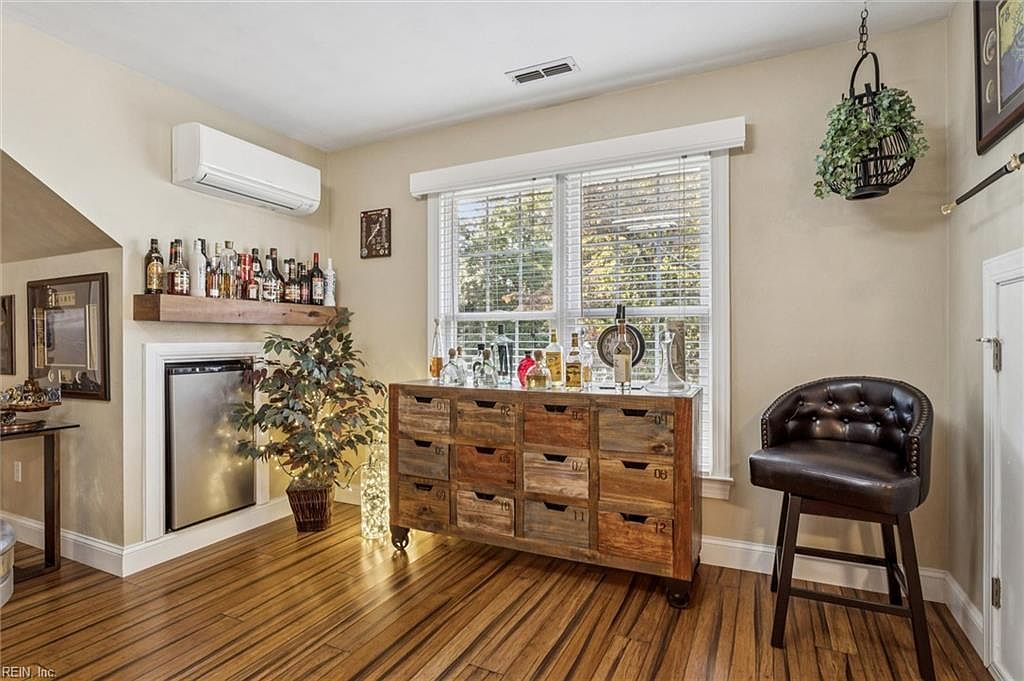 This home bar area features a cozy layout with an inviting atmosphere. The walls are painted in warm beige, complemented by rich wooden flooring that adds a sense of warmth. A rustic wooden cabinet with multiple drawers serves as storage, enhancing the space’s charm. Above it, an open shelf displays an array of liquor bottles, adding a lively touch. Natural light streams through the window adorned with blinds, creating a bright yet intimate setting. A leather upholstered bar stool offers seating, while a small potted plant by the cabinet adds a hint of greenery, balancing the aesthetic.