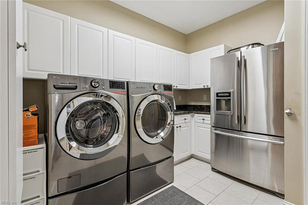 This laundry room showcases a modern layout with stainless steel appliances, including two front-loading washers and a matching dryer. The cabinetry is white, creating a clean aesthetic, paired with a dark granite countertop that adds a touch of elegance. The walls are painted a soft beige, complementing the bright cabinetry and the gleaming appliances. A gray mat sits beneath the appliances, providing comfort and practicality. Additional cabinetry above offers ample storage for laundry essentials, while an organized drawer holds supplies. The overall design emphasizes functionality while maintaining a polished, contemporary look.