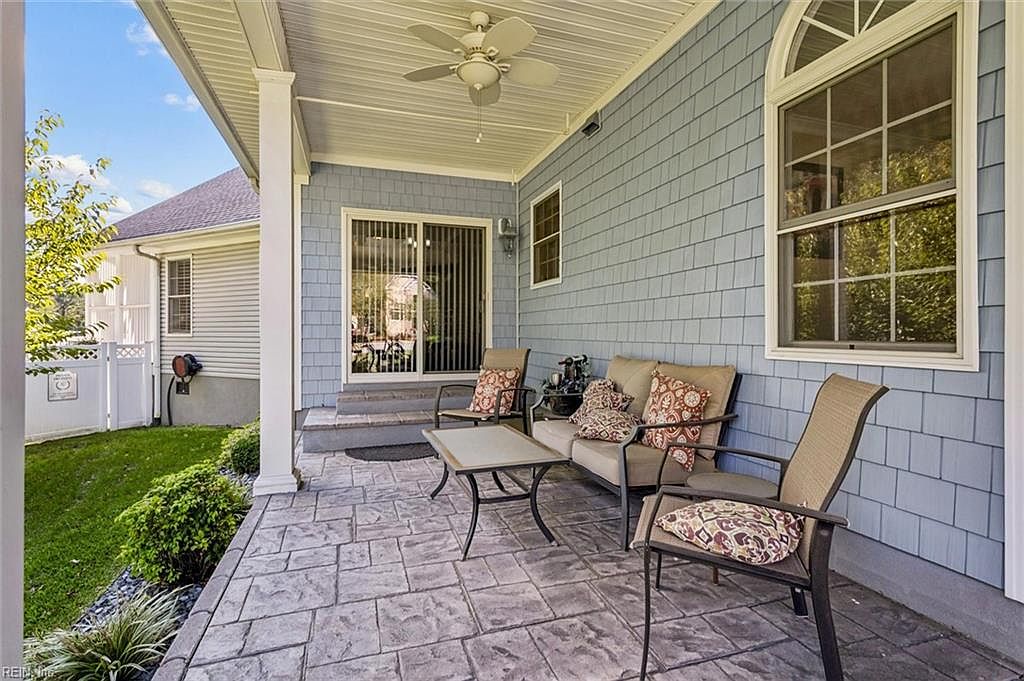 This inviting front porch features a spacious layout with a cool blue shingle exterior that complements the home’s traditional charm. The flooring showcases an elegant stone pattern, enhancing the outdoor aesthetic. Two plush armchairs and a cozy loveseat, adorned with colorful patterned cushions, create a welcoming seating area. A ceiling fan hangs above, ensuring comfort on warm days. Large windows provide ample natural light, enhancing the cheerful ambiance. Lush greenery surrounds the porch, adding vibrancy, while a well-maintained lawn and decorative plants frame the entrance, making it a delightful space for relaxation and social gatherings.