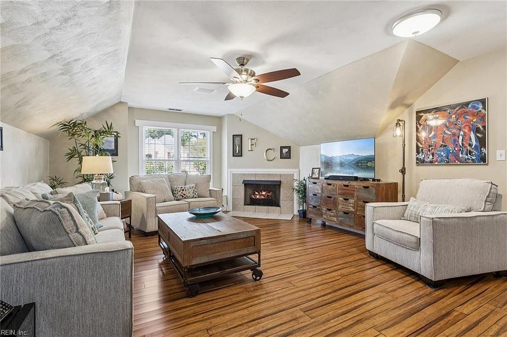 This cozy living room features a warm color palette highlighted by beige walls and rich wooden flooring. The layout includes a plush gray sectional sofa, complemented by an assortment of decorative pillows in varying shades of blue and teal. A rustic coffee table serves as the centerpiece, flanked by comfortable armchairs. Natural light floods the space through large, multi-pane windows, and a stylish ceiling fan enhances airflow. A charming fireplace, framed with decorative tiles, adds a focal point for gatherings. Wall accents include framed artwork and metallic letters, creating an inviting and personalized atmosphere.