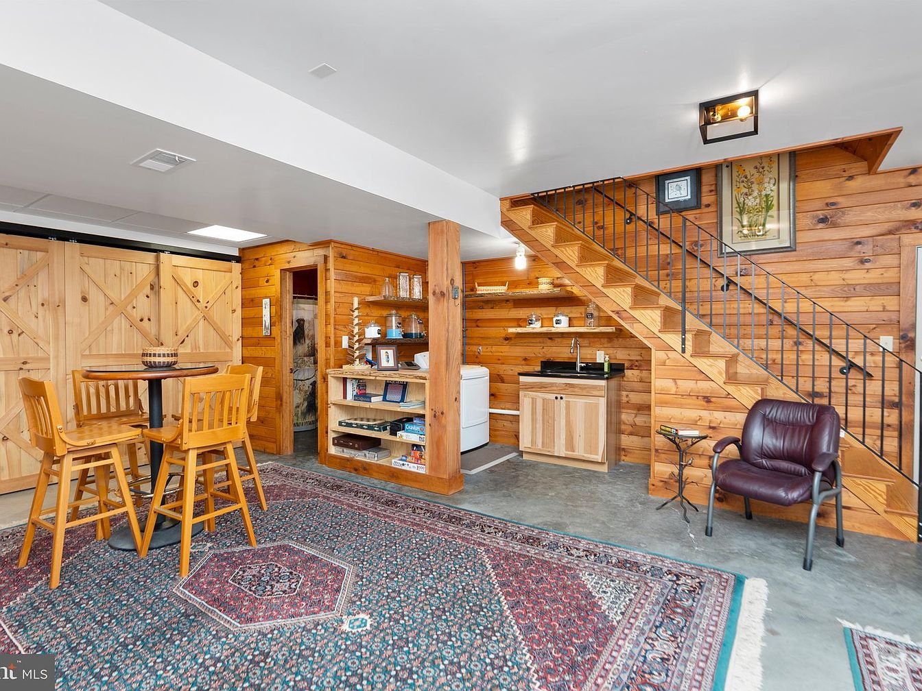 A cozy basement lounge area featuring warm wooden paneling that creates an inviting atmosphere. The space includes a round table with two wooden chairs, perfect for casual gatherings. A plush maroon upholstered chair complements the setting, situated next to a small side table. The flooring is a textured gray concrete, contrasting nicely with a richly patterned area rug that adds color and warmth. Against one wall, a sleek black countertop with modern appliances offers functionality, while open shelving holds decorative items and books. A staircase with well-crafted wooden steps leads to the upper levels, enhancing the home’s rustic charm.