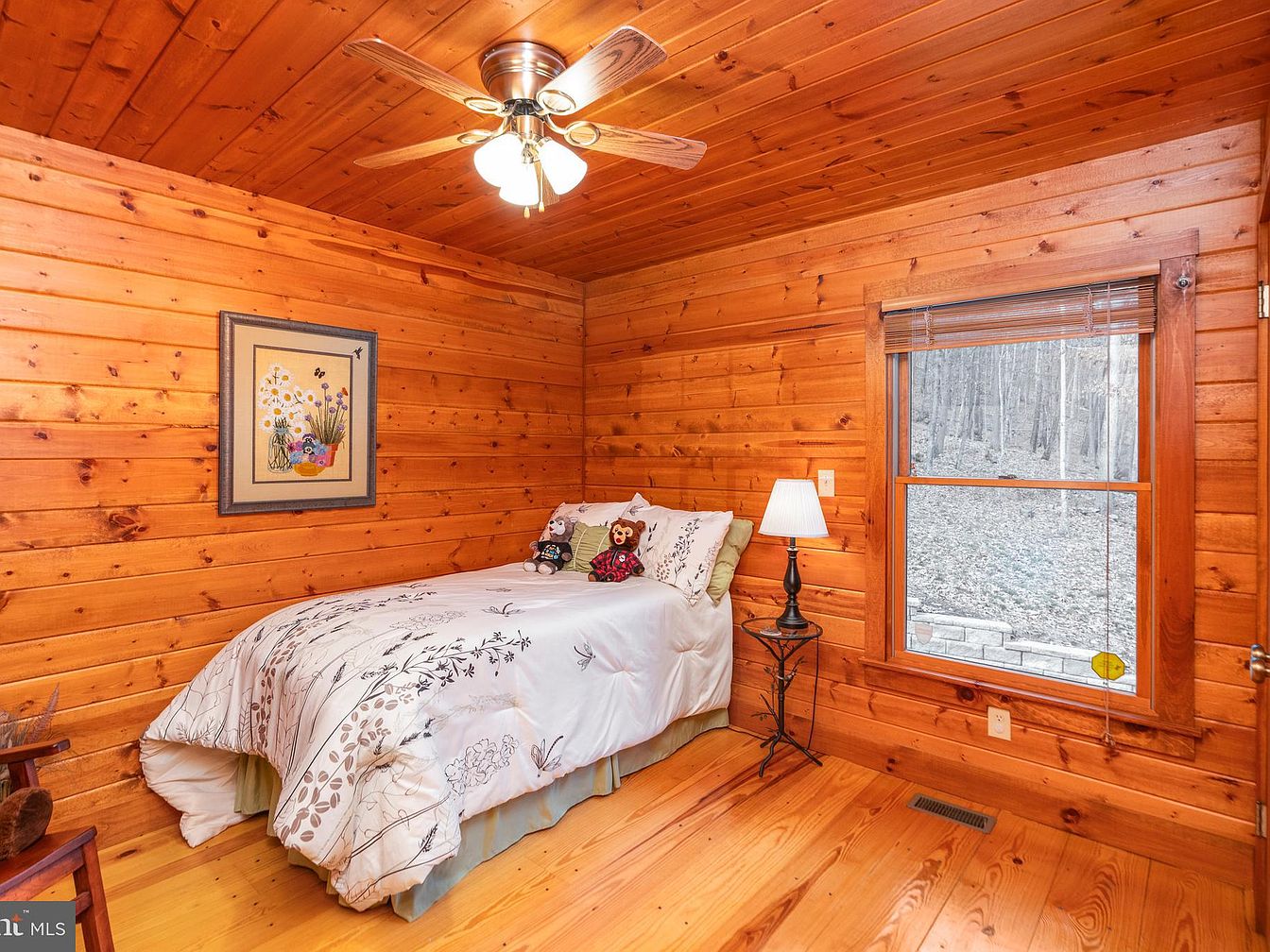 The bedroom features warm, wooden paneling that envelops the space, creating a cozy cabin ambiance. A snug twin bed occupies one corner, adorned with a floral-embroidered white comforter that adds a touch of elegance. Beside the bed, a slender black metal lamp provides soft lighting, while a small wooden chair complements the rustic theme. A charming floral painting adorns the wall, bringing color to the natural wood hues. The window offers a glimpse of the serene outdoors, with wooden blinds partially drawn. Subtle wooden flooring enhances the room’s warmth and charm, inviting relaxation.