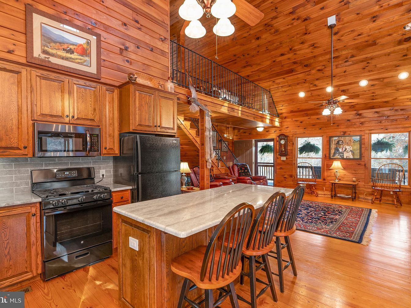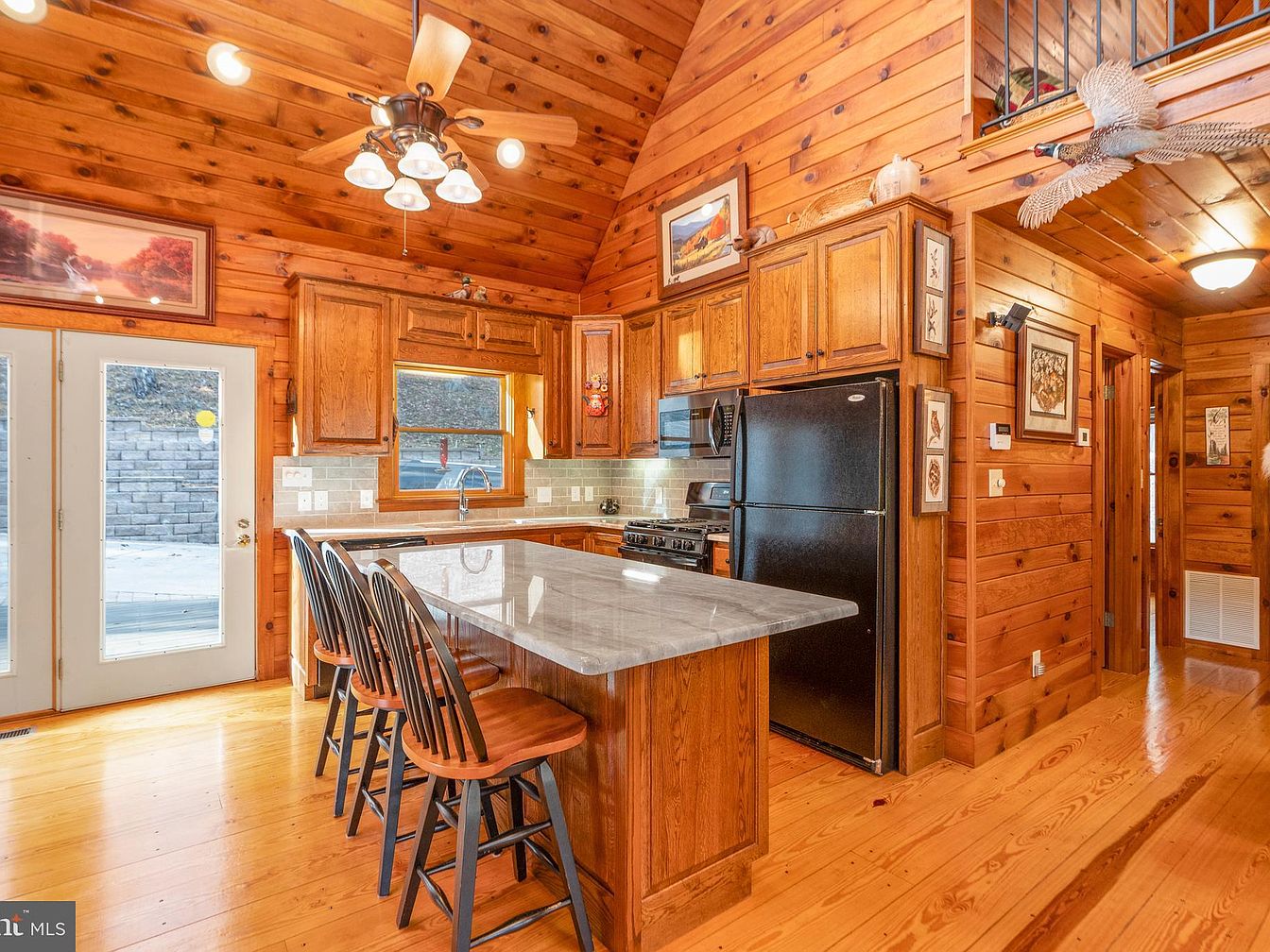 This cozy kitchen features warm wooden tones throughout, from the log-style walls to the rich cabinetry. The island countertop, finished in a sleek gray, contrasts beautifully with the deep brown of the cabinets. Four black wooden bar stools provide a casual dining option, inviting social interaction. A ceiling fan with light fixtures adds a functional yet stylish touch. Large French doors allow natural light to flood the space, offering a view of the outdoors. Subtle decorative artwork adorns the walls, enhancing the rustic charm while maintaining a welcoming atmosphere. Stainless steel appliances complete the kitchen’s modernity.