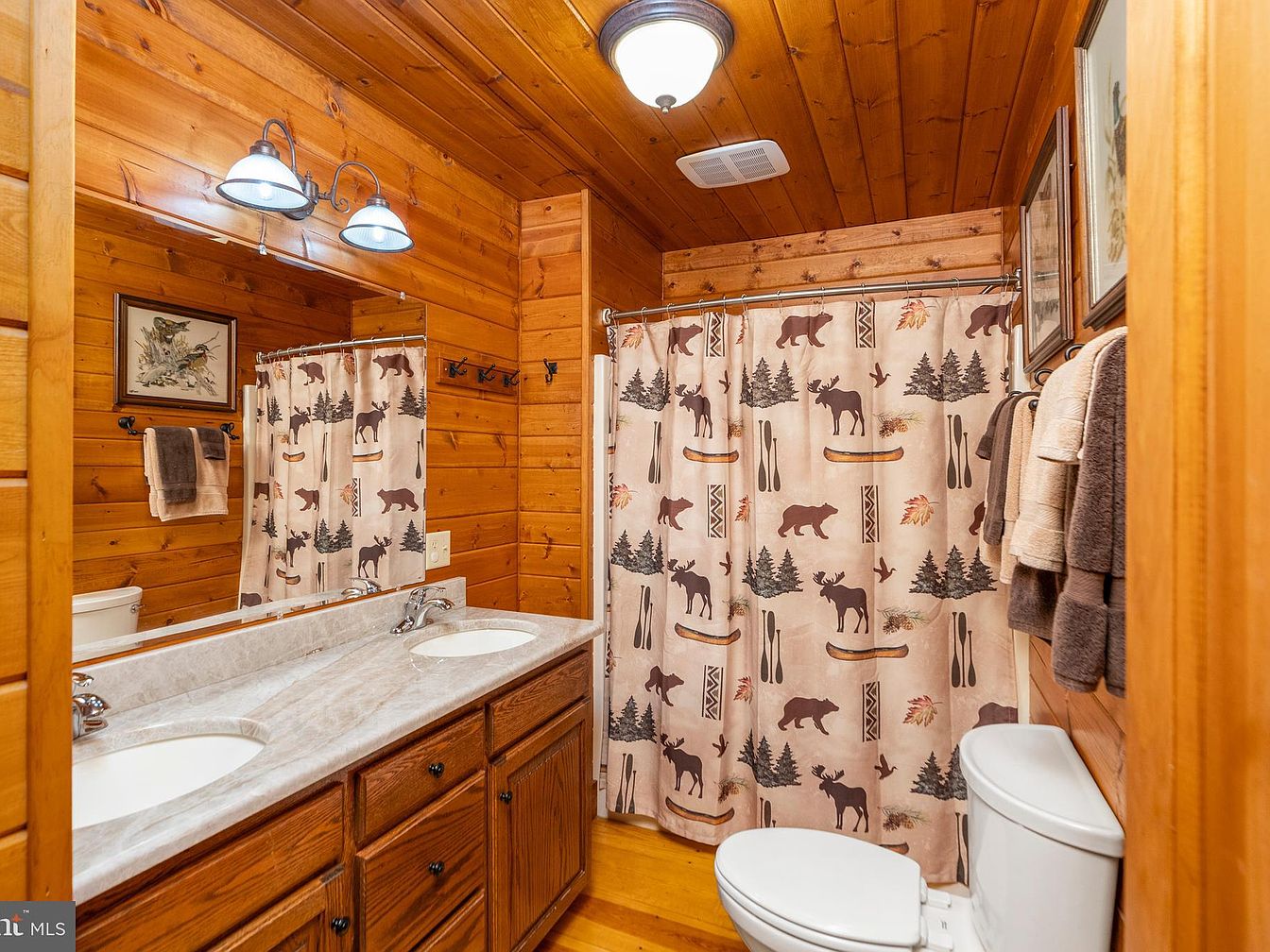 The bathroom features rustic wooden paneling that creates a warm and inviting atmosphere. A double vanity with a smooth marble countertop complements the rich brown cabinetry. Above the sink, dual industrial-style light fixtures enhance the space’s charm. The shower curtain, adorned with bear and tree motifs, brings an outdoorsy feel, harmonizing with the wood accents. Towel racks are stylishly placed beside the sink, showcasing neatly folded towels in neutral shades. Decorate with framed artwork, adding a personal touch. The overall aesthetic is a blend of comfort and nature, making it a cozy retreat within the home.