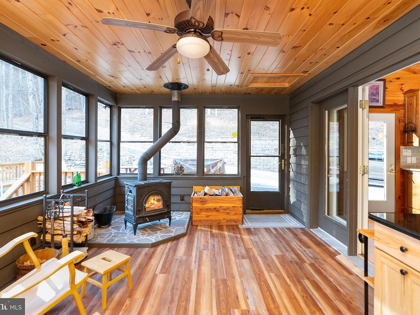 This sunroom features a cozy, rustic aesthetic, characterized by warm wooden tones throughout. The wooden ceiling complements the gray walls, creating a calming atmosphere. Large, floor-to-ceiling windows allow plenty of natural light and offer views of the outdoors. A black wood stove, situated on a stone base, serves as a focal point, enhancing comfort during colder months. Nearby, a small stack of logs adds to the rustic charm. Functional wooden furniture, including a pair of simple chairs and a wooden box, defines the space, encouraging relaxation and connection with nature.