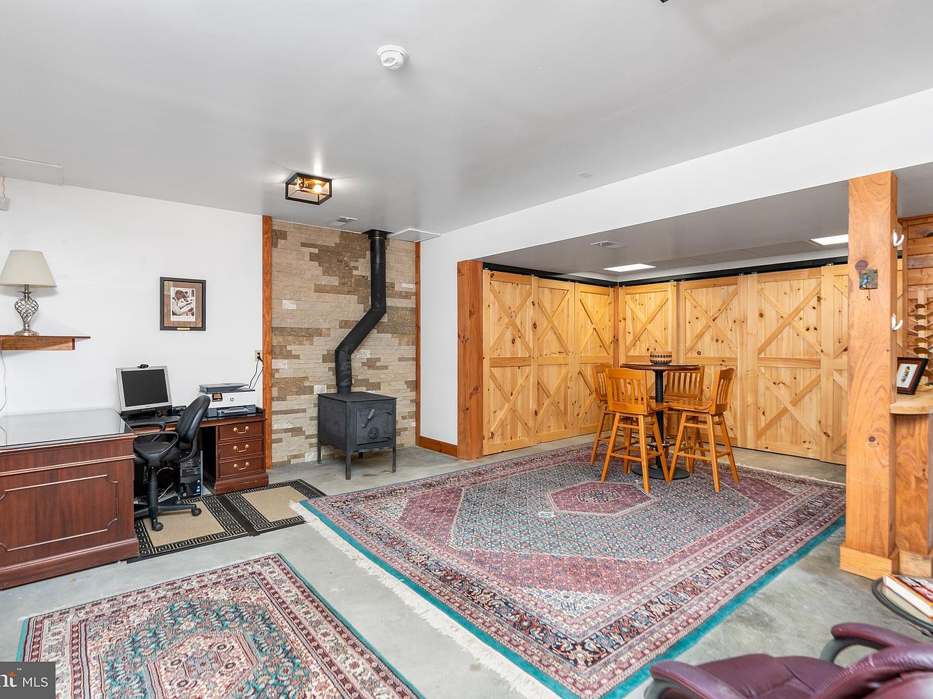 This spacious recreation room features a blend of functionality and comfort. A wooden desk with a matching chair occupies one corner, ideal for work or study. Adjacent is a cozy sitting area with a compact table and four wooden chairs, inviting social interactions. The rich tones of the exposed wood beams and folding doors bring warmth, while a striking stone accent wall with a black wood-burning stove adds a rustic element. The concrete flooring is softened by intricate area rugs that introduce color and pattern, harmonizing with the overall earthy palette, creating an inviting atmosphere.