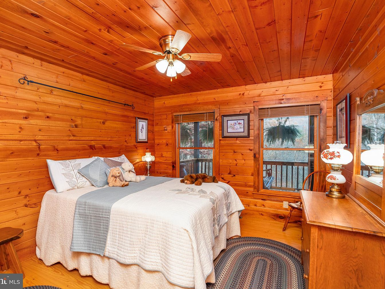 This cozy bedroom showcases rich wooden paneling and a warm, inviting atmosphere. A large bed, adorned with a light quilt and decorative pillows, occupies the center, complementing the honey-colored wood. Two windows allow natural light, framed by wooden trims, offering views of the surrounding greenery. A wooden rocking chair sits beside a vintage dresser topped with an antique lamp, contributing to the rustic charm. Soft area rugs provide comfort underfoot, while framed artwork adds personal touches to the walls. Overall, the space combines warmth, tradition, and a touch of nostalgia, creating a serene sanctuary.